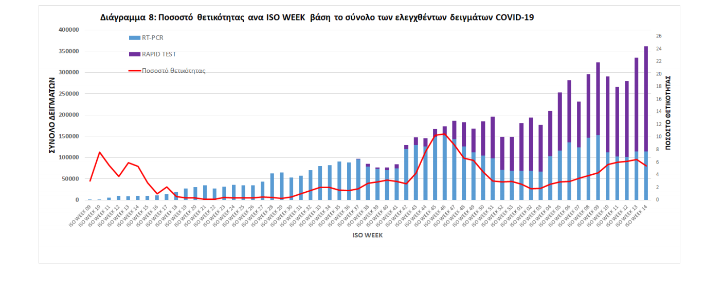 ISO WEEK Την εβδομάδα 05 – 11 Απριλίου (Iso Week 14) το ποσοστό θετικότητας ήταν 5.47% σε σύνολο 113.722 RT-PCR και 247.895 Rapid Ag τεστ που πραγματοποιήθηκαν.