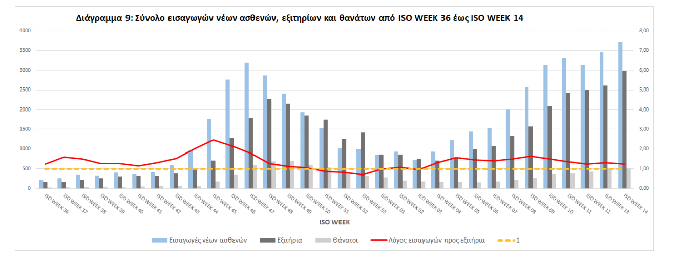 Την εβδομάδα 05 – 11 Απριλίου (Iso Week 14) οι εισαγωγές νέων ασθενών ήταν 3.707, ενώ το σύνολο των εξιτηρίων λόγω ίασης ήταν 2.987. O λόγος εισαγωγών νέων ασθενών προς εξιτήρια λόγω ίασης ήταν 1.24.