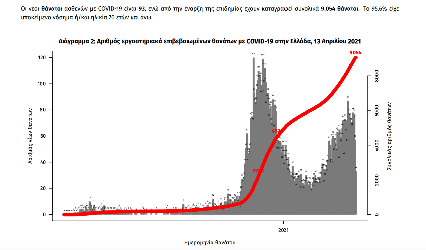 Τα στοιχεία που παρουσιάζονται αφορούν περιστατικά από την επιδημιολογική επιτήρηση της νόσου από το νέο κορωνοϊό (COVID19), με βάση τα δεδομένα που έχουν δηλωθεί στον ΕΟΔΥ και καταγραφεί μέχρι τις 13 Απριλίου 2021 (ώρα 15:00). Τα νέα εργαστηριακά επιβεβαιωμένα κρούσματα της νόσου που καταγράφηκαν τις τελευταίες 24 ώρες είναι 4.033, εκ των οποίων 15 εντοπίστηκαν κατόπιν ελέγχων στις πύλες εισόδου της χώρας.