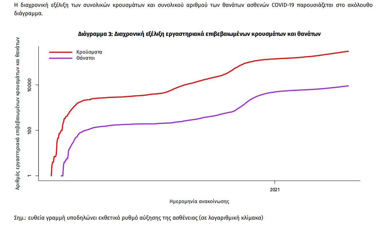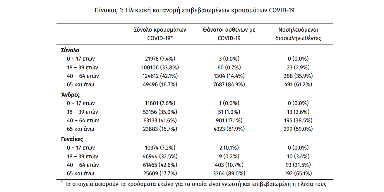 Ο αριθμός των ασθενών που νοσηλεύονται διασωληνωμένοι είναι 802 (63.2% άνδρες). Η διάμεση ηλικία τους είναι 67 έτη. To 83.4% έχει υποκείμενο νόσημα ή/και ηλικία 70 ετών και άνω. Από την αρχή της πανδημίας έχουν εξέλθει από τις ΜΕΘ 1.901 ασθενείς. Οι εισαγωγές2 νέων ασθενών Covid-19 στα νοσοκομεία της επικράτειας είναι 458 (ημερήσια μεταβολή -15.03%). Ο μέσος όρος εισαγωγών του επταημέρου είναι 520 ασθενείς.Η διάμεση ηλικία των κρουσμάτων είναι 44 έτη (εύρος 0.2 έως 106 έτη), ενώ η διάμεση ηλικία των θανόντων είναι 79 έτη (εύρος 0.2 έως 106 έτη). Διάγραμμα 4: Ηλικιακή Κατανομή κρουσμάτων, νοσηλευόμενων στις MEΘ και ασθενών που απεβίωσαν από την αρχή της πανδημίας