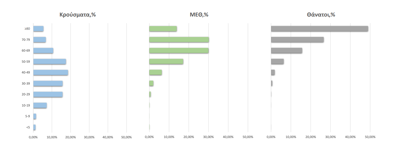 Ακολούθως παρουσιάζεται η ηλικιακή κατανομή των (α) συνολικών κρουσμάτων, (β) των περιστατικών που κατέληξαν σε θάνατο και (γ) των ασθενών που νοσηλεύονται διασωληνωμένοι: