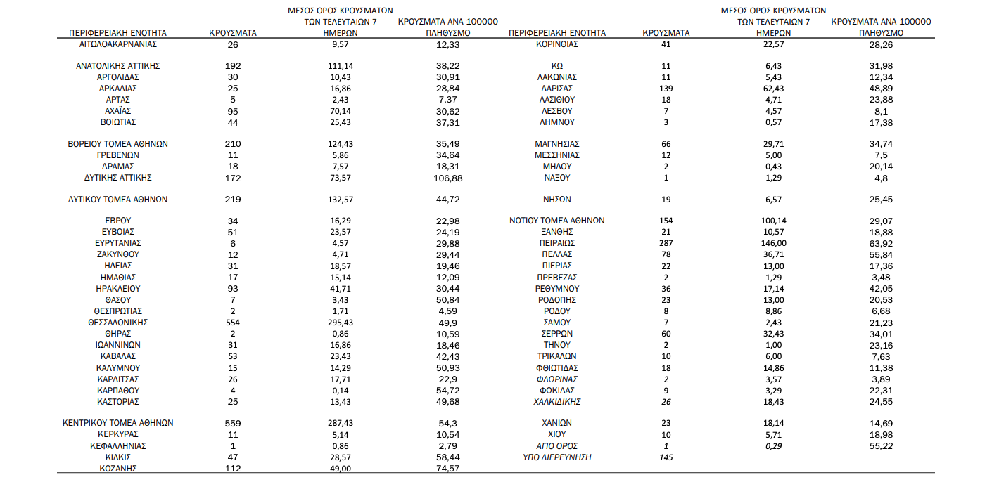Κατανομή ανακοινωθέντων εγχώριων κρουσμάτων: Από το σύνολο των 4.033 νέων κρουσμάτων του νέου ιού στη χώρα 19 είναι εισαγόμενα εκ των οποίων 15 εντοπίστηκαν κατόπιν ελέγχων στις πύλες εισόδου της χώρας. Η κατανομή των 4.014 νέων εγχώριων κρουσμάτων ανά Περιφερειακή Ενότητα παρουσιάζεται στον κατωτέρω πίνακα.3 Πίνακας 2: Ημερήσιος αριθμός και κρούσματα ανά 100.000 πληθυσμού επιβεβαιωμένων εγχώριων κρουσμάτων COVID-19 ανά περιφερειακή ενότητα στις 13 Απριλίου 2021