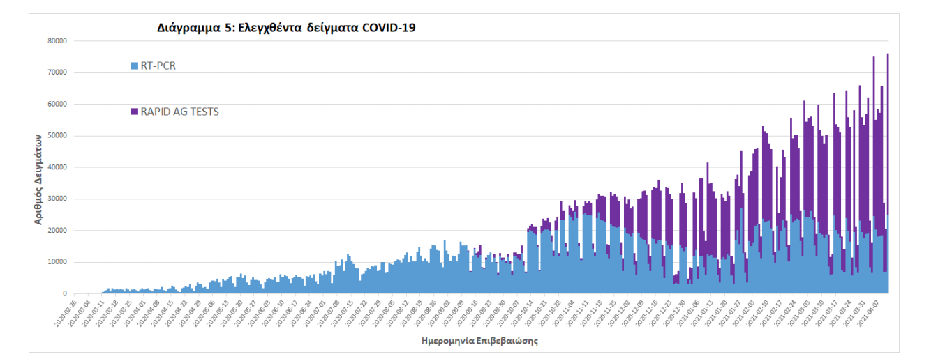 Δείγματα που έχουν ελεγχθεί: Από την 1η Ιανουαρίου 2020 μέχρι σήμερα, στα εργαστήρια που διενεργούν ελέγχους για τον νέο κορωνοϊό (SARS-CoV-2) και που δηλώνουν συστηματικά το σύνολο των δειγμάτων που ελέγχουν, έχουν συνολικά ελεγχθεί 4.381.024 κλινικά δείγματα ενώ από Μονάδες Υγείας και Κλιμάκια του ΕΟΔΥ που διενεργούν ελέγχους Rapid Ag έχουν ελεγχθεί 2.804.517 δείγματα. O μέσος όρος του επταημέρου είναι 51.786 δειγματοληπτικοί έλεγχοι. Mαζικές Δειγματοληψίες ΕΟΔΥ: Στις 12 Απριλίου 2021, πραγματοποιήθηκαν 115 δράσεις ανοικτών δειγματοληπτικών ελέγχων από τις Κινητές Ομάδες Υγείας (ΚΟΜΥ) του ΕΟΔΥ, στις οποίες διενεργήθηκαν 16.649 έλεγχοι Rapid Ag και ανευρέθηκαν 497 θετικά (2,99%).