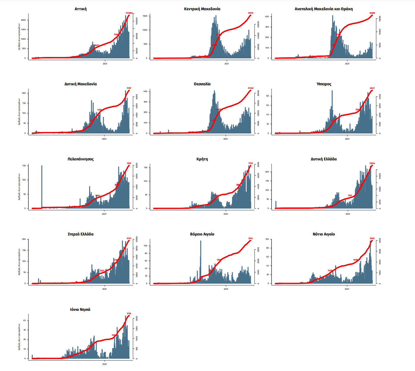 Παράρτημα 1: Επιδημικές καμπύλες κρουσμάτων COVID-19 με βάση την δηλωθείσα διεύθυνση μόνιμης κατοικίας του κρούσματος ή τη διεύθυνση προσωρινής διαμονής για τους τουρίστες και άλλους προσωρινά διαμένοντες στην Ελλάδα. Συμπεριλαμβάνονται τόσο κρούσματα με ιστορικό ταξιδίου όσο και κρούσματα με πιθανή εγχώρια μετάδοση.