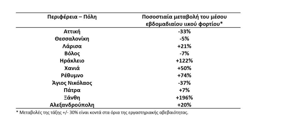 Παράρτημα 2: ΕΘΝΙΚΟ ΔΙΚΤΥΟ ΕΠΙΔΗΜΙΟΛΟΓΙΑΣ ΛΥΜΑΤΩΝ ΕΟΔΥ Ανακοινώνονται τα αποτελέσματα των εργαστηριακών ελέγχων του Εθνικού Δικτύου Επιδημιολογίας Λυμάτων για την επιδημιολογική επιτήρηση του ιού SARS-CoV-2 σε αστικά λύματα, το οποίο λειτουργεί υπό το συντονισμό του ΕΟΔΥ. Τα αποτελέσματα αφορούν την περίοδο από 5 έως 11 Απριλίου 2021. Τα δείγματα προέρχονται από την Περιφέρεια Αττικής και τις πόλεις της Θεσσαλονίκης, της Λάρισας, του Βόλου, του Ηρακλείου, των Χανίων, του Ρεθύμνου, του Αγίου Νικολάου Λασιθίου, της Πάτρας, της Ξάνθης και της Αλεξανδρούπολης. Τα δείγματα λαμβάνονται από τις εισόδους των εκάστοτε Μονάδων Επεξεργασίας Λυμάτων και αντιστοιχούν στον πληθυσμό που εξυπηρετείται από αυτές. Πίνακας 1: Ποσοστιαία μεταβολή στη μέση εβδομαδιαία συγκέντρωση του ιικού φορτίου του SARS-CoV-2 στα αστικά λύματα ανά 100.000 κατοίκους την εβδομάδα 5 – 11 Απριλίου 2021 σε σχέση με την εβδομάδα 29 Μαρτίου – 4 Απριλίου 2021.