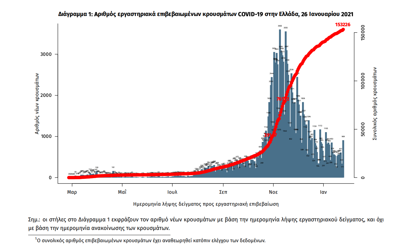 Τα στοιχεία που παρουσιάζονται αφορούν περιστατικά από την επιδημιολογική επιτήρηση της νόσου από το νέο κορωνοϊό (COVID19), με βάση τα δεδομένα που έχουν δηλωθεί στον ΕΟΔΥ και καταγραφεί μέχρι τις 26 Ιανουαρίου 2021 (ώρα 15:00). Τα νέα εργαστηριακά επιβεβαιωμένα κρούσματα της νόσου είναι 842, εκ των οποίων 13 εντοπίστηκαν κατόπιν ελέγχων στις πύλες εισόδου της χώρας. Ο συνολικός αριθμός των κρουσμάτων ανέρχεται σε 153226 (ημερήσια μεταβολή +0.6%), εκ των οποίων 52.1% άνδρες. 1