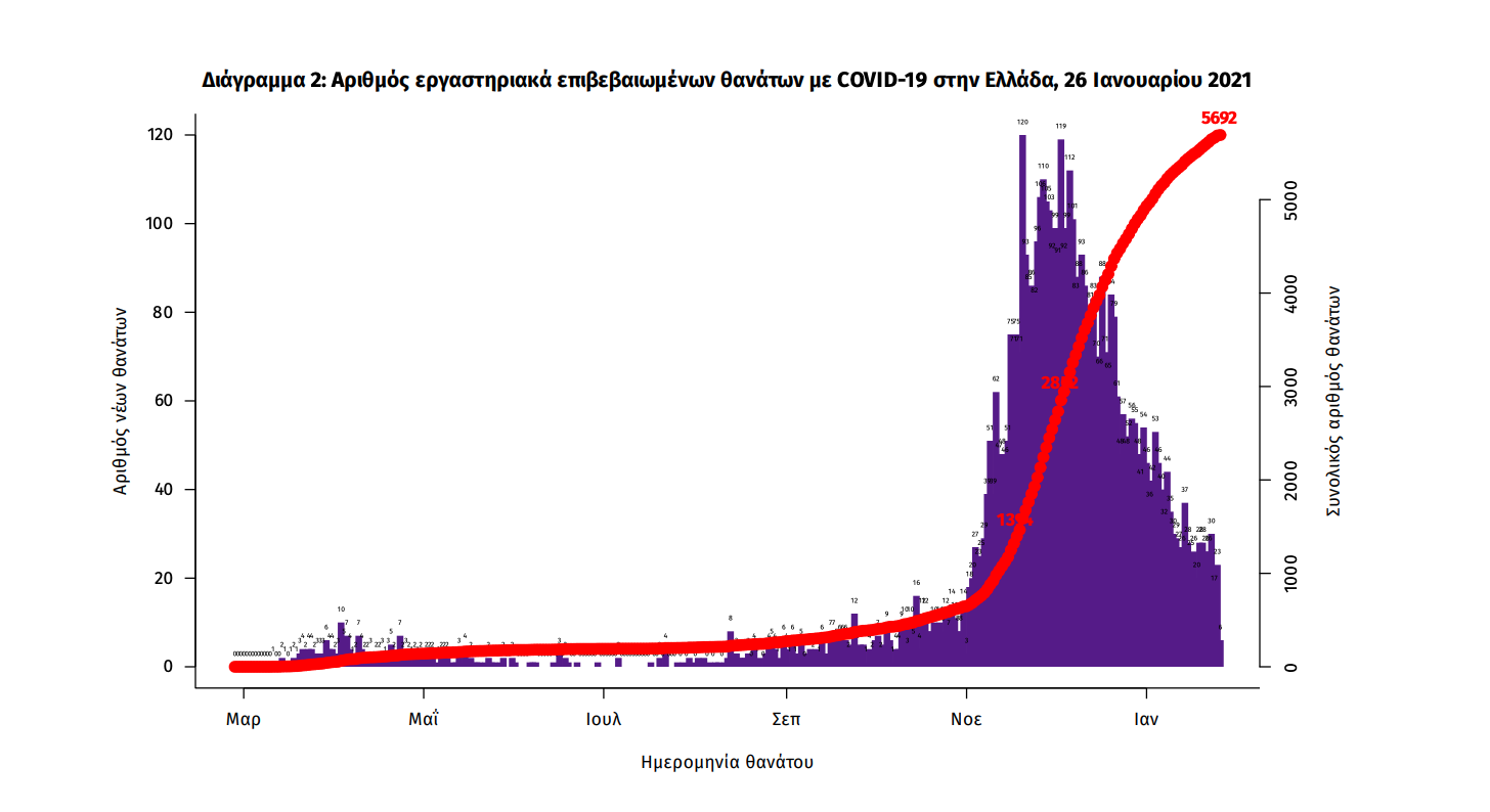 Τέλος, έχουμε 21 νέους θανάτους από τη νόσο COVID-19, φθάνοντας τους 5692 θανάτους συνολικά στη χώρα, εκ των οποίων 3351 (58.9%) άνδρες. Η διάμεση ηλικία των θανόντων συμπολιτών μας ήταν τα 79 έτη και το 95.4% είχε κάποιο υποκείμενο νόσημα ή/και ηλικία 70 ετών και άνω.