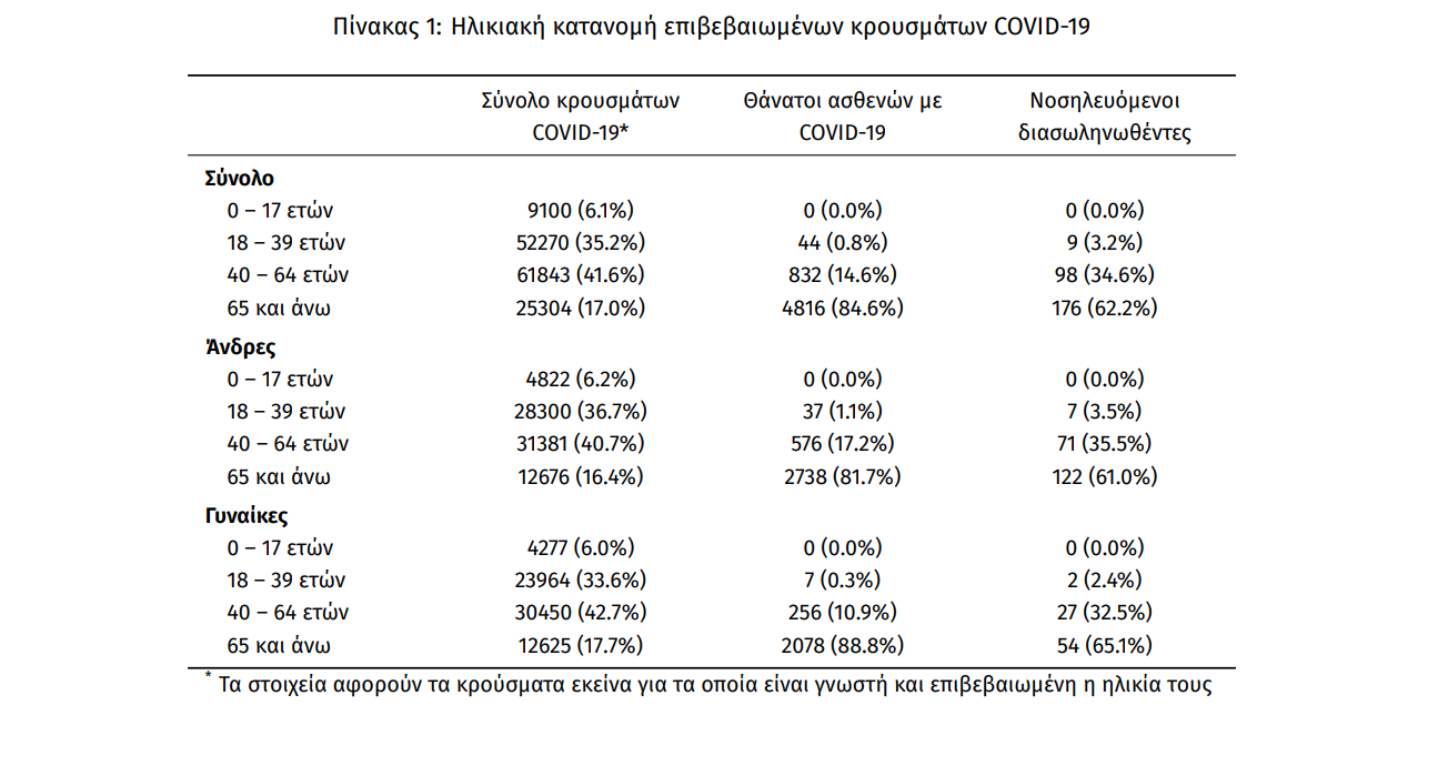 Η διάμεση ηλικία των κρουσμάτων είναι 44 έτη (εύρος 0.2 έως 105 ετών), ενώ η διάμεση ηλικία των θανάτων είναι 79 έτη (εύρος 24 έως 103 ετών). Η ηλικιακή κατανομή των (α) συνολικών κρουσμάτων, (β) των περιστατικών που κατέληξαν σε θάνατο και (γ) των ασθενών που νοσηλεύονται διασωληνωμένοι, είναι η ακόλουθη:
