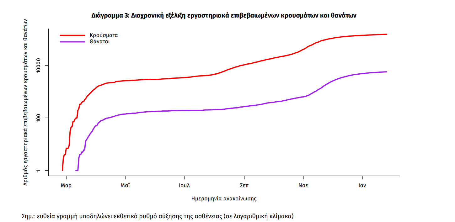 Η διαχρονική εξέλιξη των συνολικών κρουσμάτων και συνολικού αριθμού των θανάτων ασθενών COVID-19 παρουσιάζεται στο ακόλουθο διάγραμμα.