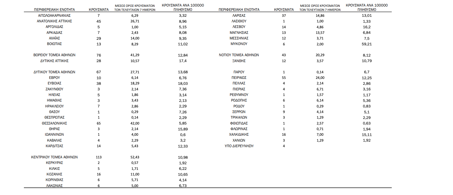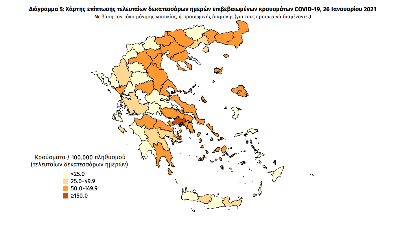 Γεωγραφική διασπορά Ο χάρτης αποτυπώνει τη γεωγραφική κατανομή των συνολικών κρουσμάτων COVID-19 (από την αρχή της επιδημίας) ανά Περιφερειακή Ενότητα της χώρας, με βάση την δηλωθείσα διεύθυνση μόνιμης κατοικίας του ασθενούς, ή τη διεύθυνση προσωρινής διαμονής για τους τουρίστες και άλλους προσωρινά διαμένοντες στην Ελλάδα. Συμπεριλαμβάνονται τόσο κρούσματα με ιστορικό ταξιδίου (“εισαγόμενα”) όσο και κρούσματα με πιθανή εγχώρια μετάδοση.