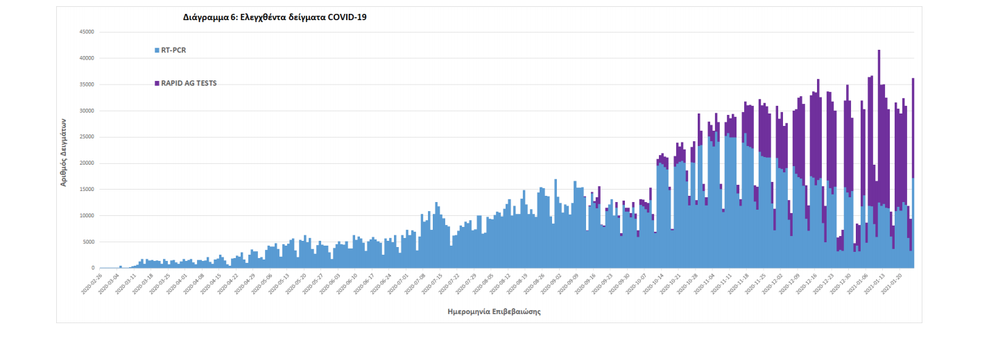 Δείγματα που έχουν ελεγχθεί: Από την 1η Ιανουαρίου 2020 μέχρι σήμερα, στα εργαστήρια που διενεργούν ελέγχους για τον νέο κορωνοϊό (SARS-CoV-2) και που δηλώνουν συστηματικά στον ΕΟΔΥ το σύνολο των δειγμάτων που ελέγχουν, έχουν συνολικά ελεγχθεί 3.051.263 κλινικά δείγματα ενώ από Μονάδες Υγείας και Κλιμάκια του ΕΟΔΥ που διενεργούν ελέγχους Rapid Ag έχουν ελεγχθεί 967.871 δείγματα.
