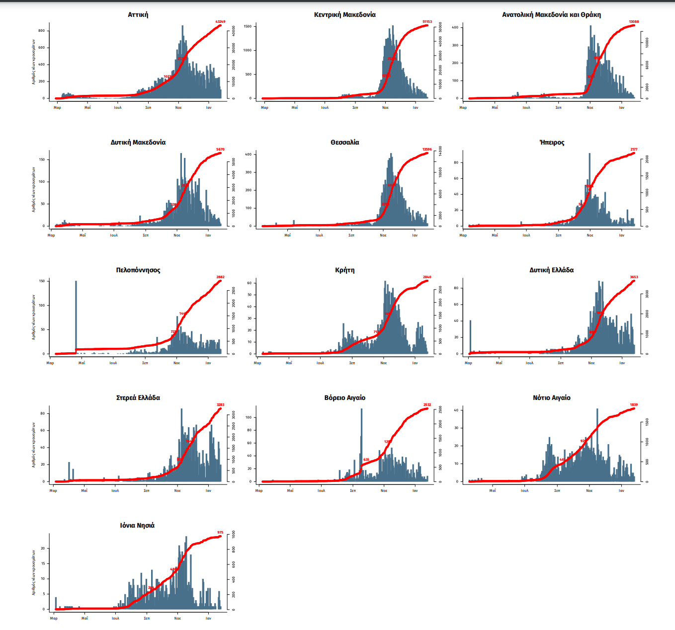 Παράρτημα 1: Επιδημικές καμπύλες κρουσμάτων COVID-19 με βάση την δηλωθείσα διεύθυνση μόνιμης κατοικίας του κρούσματος ή τη διεύθυνση προσωρινής διαμονής για τους τουρίστες και άλλους προσωρινά διαμένοντες στην Ελλάδα. Συμπεριλαμβάνονται τόσο κρούσματα με ιστορικό ταξιδίου όσο και κρούσματα με πιθανή εγχώρια μετάδοση.
