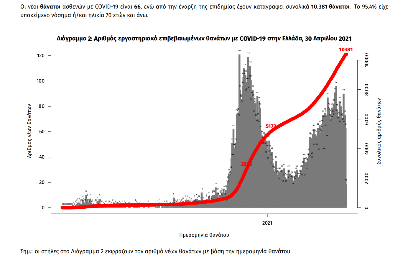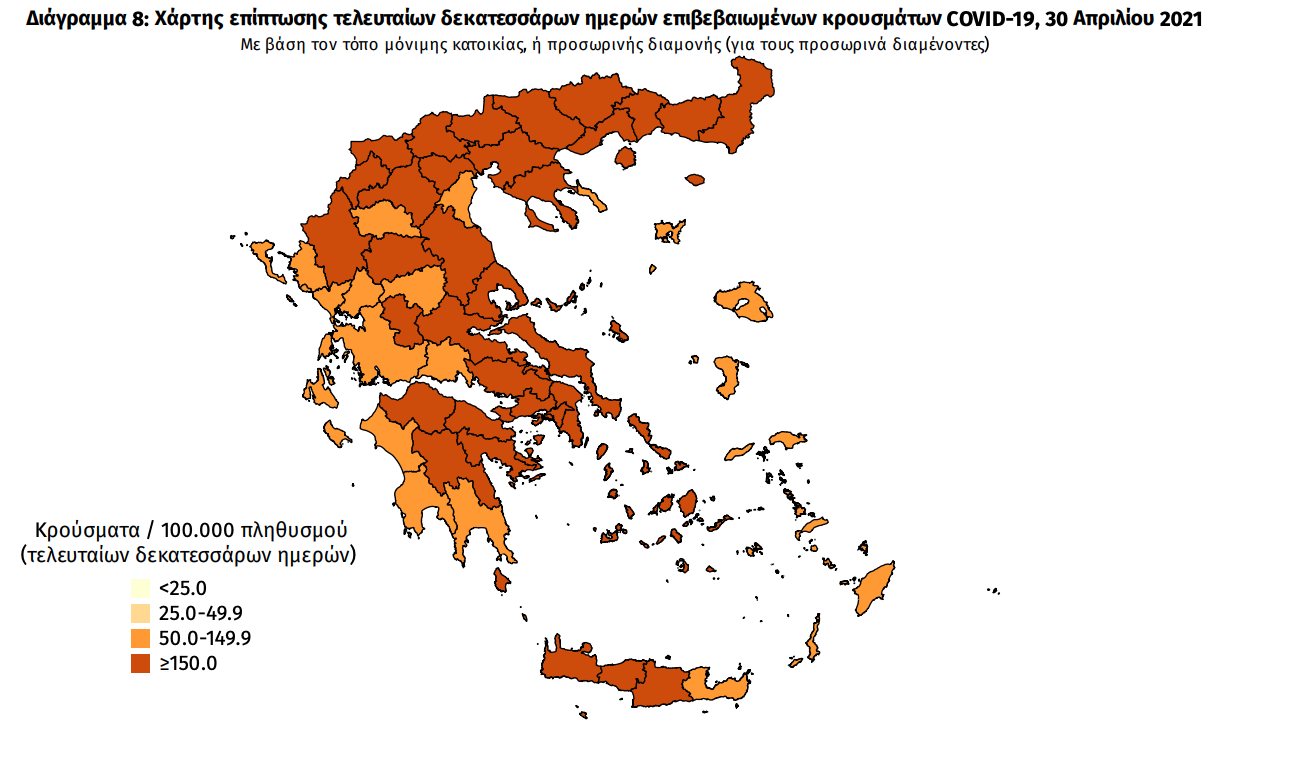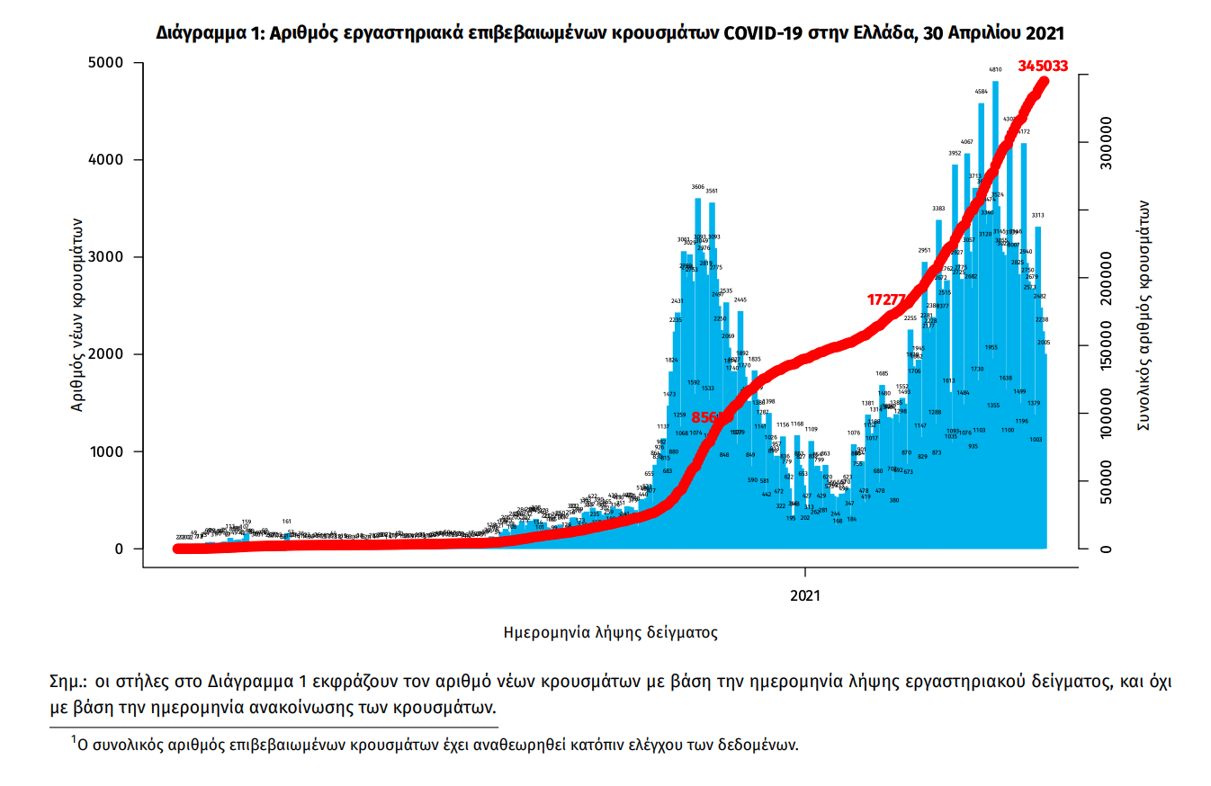 Τα στοιχεία που παρουσιάζονται αφορούν περιστατικά από την επιδημιολογική επιτήρηση της νόσου από το νέο κορωνοϊό (COVID19), με βάση τα δεδομένα που έχουν δηλωθεί στον ΕΟΔΥ και καταγραφεί μέχρι τις 30 Απριλίου 2021 (ώρα 15:00). Τα νέα εργαστηριακά επιβεβαιωμένα κρούσματα της νόσου που καταγράφηκαν τις τελευταίες 24 ώρες είναι 2.155, εκ των οποίων 9 εντοπίστηκαν κατόπιν ελέγχων στις πύλες εισόδου της χώρας.