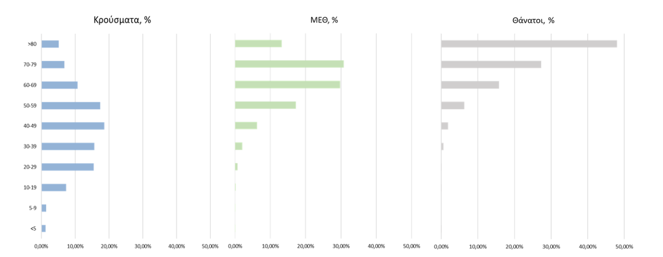 Ο αριθμός των ασθενών που νοσηλεύονται διασωληνωμένοι είναι 802 (62.2% άνδρες). Η διάμεση ηλικία τους είναι 68 έτη. To 84.5% έχει υποκείμενο νόσημα ή/και ηλικία 70 ετών και άνω. Από την αρχή της πανδημίας έχουν εξέλθει από τις ΜΕΘ 2.121 ασθενείς. Οι εισαγωγές2 νέων ασθενών Covid-19 στα νοσοκομεία της επικράτειας είναι 419 (ημερήσια μεταβολή -13.43%). Ο μέσος όρος εισαγωγών του επταημέρου είναι 458 ασθενείς.Η διάμεση ηλικία των κρουσμάτων είναι 44 έτη (εύρος 0.2 έως 106 έτη), ενώ η διάμεση ηλικία των θανόντων είναι 78 έτη (εύρος 0.2 έως 106 έτη). Διάγραμμα 4: Ηλικιακή Κατανομή κρουσμάτων, νοσηλευόμενων στις MEΘ και ασθενών που απεβίωσαν από την αρχή της πανδημίας