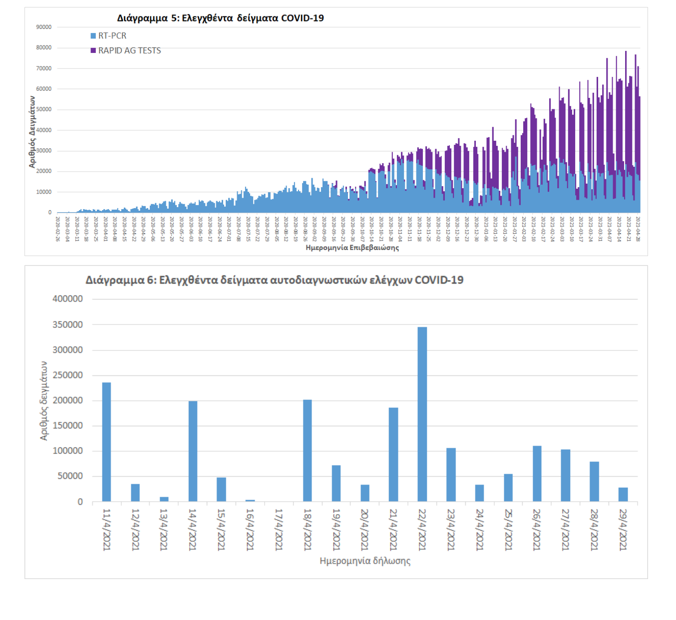 Δείγματα που έχουν ελεγχθεί: Από την 1η Ιανουαρίου 2020 μέχρι σήμερα, στα εργαστήρια που διενεργούν ελέγχους για τον νέο κορωνοϊό (SARS-CoV-2) και που δηλώνουν συστηματικά το σύνολο των δειγμάτων που ελέγχουν, έχουν συνολικά ελεγχθεί 4.660.896 κλινικά δείγματα ενώ από Μονάδες Υγείας και Κλιμάκια του ΕΟΔΥ που διενεργούν ελέγχους Rapid Ag έχουν ελεγχθεί 3.475.264 δείγματα. O μέσος όρος του επταημέρου είναι 53.906 δειγματοληπτικοί έλεγχοι. Αυτοδιαγνωστικοί έλεγχοι (Self-tests): Έως 30 Απριλίου 2021, έχουν καταγραφεί ηλεκτρονικά 1.892.348 δηλώσεις αποτελέσματος αυτοδιαγνωστικού ελέγχου, ενώ 44.821 άτομα προσήλθαν για επανέλεγχο. Mαζικές Δειγματοληψίες ΕΟΔΥ: Στις 29 Απριλίου 2021, πραγματοποιήθηκαν 124 δράσεις δειγματοληπτικών ελέγχων από τις Κινητές Ομάδες Υγείας (ΚΟΜΥ) του ΕΟΔΥ, στις οποίες διενεργήθηκαν 18.986 έλεγχοι Rapid Ag και ανευρέθηκαν 275 θετικά (1,45%).