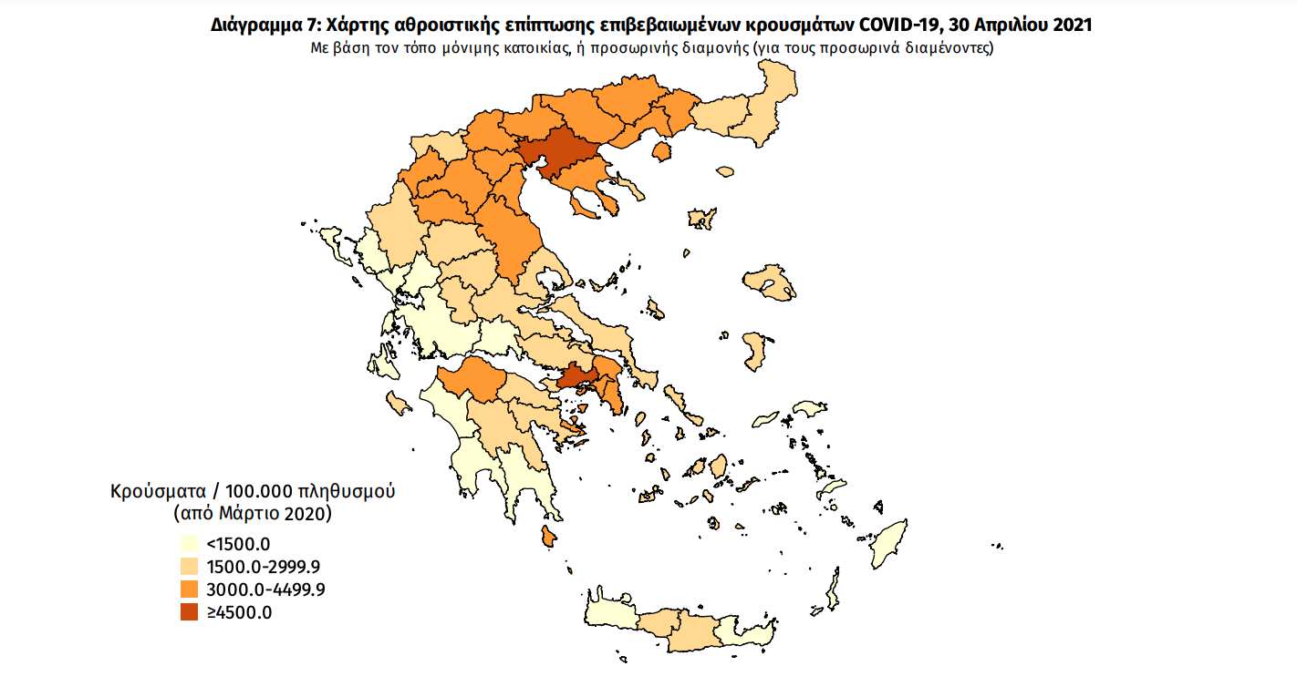 Γεωγραφική διασπορά: Ο χάρτης αποτυπώνει τη γεωγραφική κατανομή των συνολικών κρουσμάτων COVID-19 (από την αρχή της επιδημίας) ανά Περιφερειακή Ενότητα της χώρας, με βάση την δηλωθείσα διεύθυνση μόνιμης κατοικίας του ασθενούς, ή τη διεύθυνση προσωρινής διαμονής για τους τουρίστες και άλλους προσωρινά διαμένοντες στην Ελλάδα. Συμπεριλαμβάνονται τόσο κρούσματα με ιστορικό ταξιδίου (“εισαγόμενα”) όσο και κρούσματα με πιθανή εγχώρια μετάδοση.