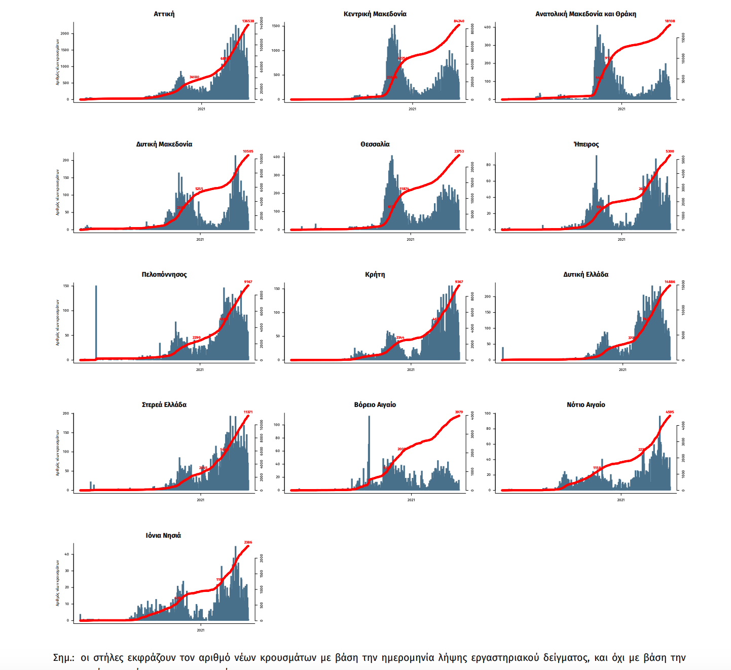 Παράρτημα 1: Επιδημικές καμπύλες κρουσμάτων COVID-19 με βάση την δηλωθείσα διεύθυνση μόνιμης κατοικίας του κρούσματος ή τη διεύθυνση προσωρινής διαμονής για τους τουρίστες και άλλους προσωρινά διαμένοντες στην Ελλάδα. Συμπεριλαμβάνονται τόσο κρούσματα με ιστορικό ταξιδίου όσο και κρούσματα με πιθανή εγχώρια μετάδοση.