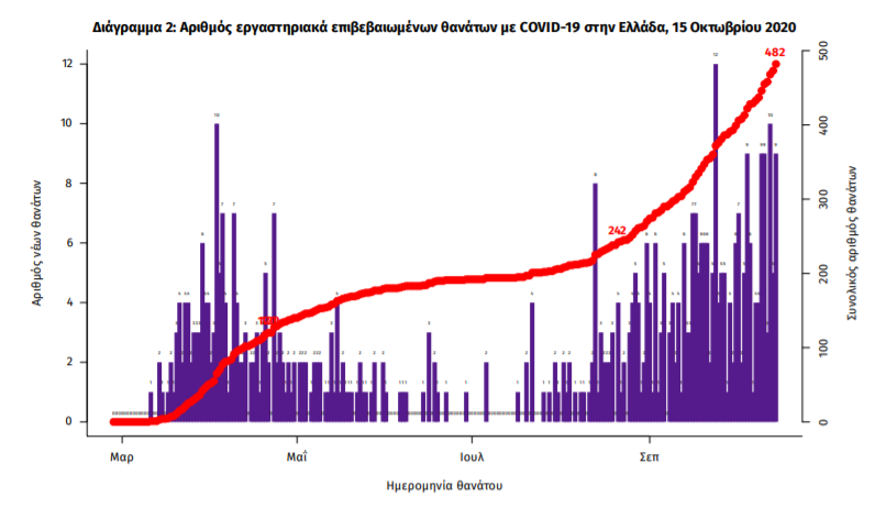Τέλος, έχουμε 13 ακόμα καταγεγραμμένους θανάτους και 482 θανάτους συνολικά στη χώρα. 181 (37.6%) γυναίκες και οι υπόλοιποι άνδρες. Η διάμεση ηλικία των θανόντων συμπολιτών μας ήταν τα 79 έτη και το 96.3% είχε κάποιο υποκείμενο νόσημα ή/και ηλικία 70 ετών και άνω.