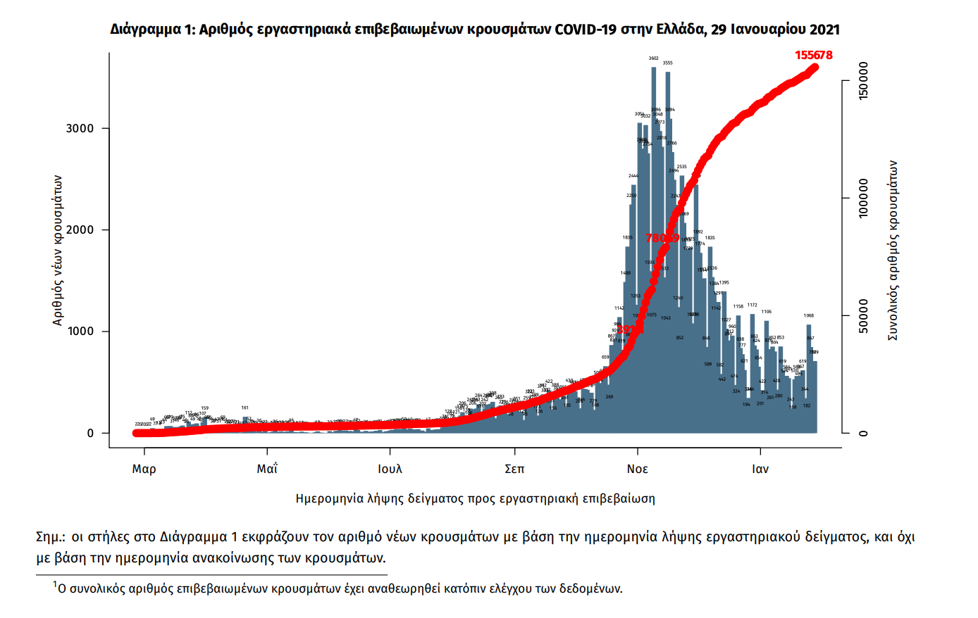 Τα στοιχεία που παρουσιάζονται αφορούν περιστατικά από την επιδημιολογική επιτήρηση της νόσου από το νέο κορωνοϊό (COVID19), με βάση τα δεδομένα που έχουν δηλωθεί στον ΕΟΔΥ και καταγραφεί μέχρι τις 29 Ιανουαρίου 2021 (ώρα 15:00). Τα νέα εργαστηριακά επιβεβαιωμένα κρούσματα της νόσου είναι 941, εκ των οποίων 17 εντοπίστηκαν κατόπιν ελέγχων στις πύλες εισόδου της χώρας. Ο συνολικός αριθμός των κρουσμάτων ανέρχεται σε 155678 (ημερήσια μεταβολή +0.6%), εκ των οποίων 52.1% άνδρες. 1 Οι νέοι θάνατοι ασθενών με COVID-19 είναι 22, ενώ από την έναρξη της επιδημίας έχουν καταγραφεί συνολικά 5764 θάνατοι. Η διάμεση ηλικία των ασθενών που απεβίωσαν είναι 79 έτη. Ο αριθμός των ασθενών που νοσηλεύονται διασωληνωμένοι είναι 260 (74.2% άνδρες). Η ημερήσια κατανομή των επιβεβαιωμένων κρουσμάτων είναι η ακόλουθη (η γραμμή παριστάνει την συνολική, αθροιστική κατανομή των κρουσμάτων).