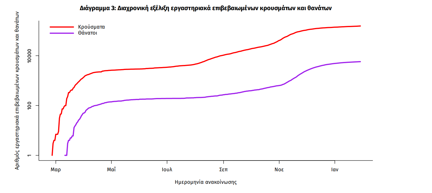 Η διαχρονική εξέλιξη των συνολικών κρουσμάτων και συνολικού αριθμού των θανάτων ασθενών COVID-19 παρουσιάζεται στο ακόλουθο διάγραμμα.