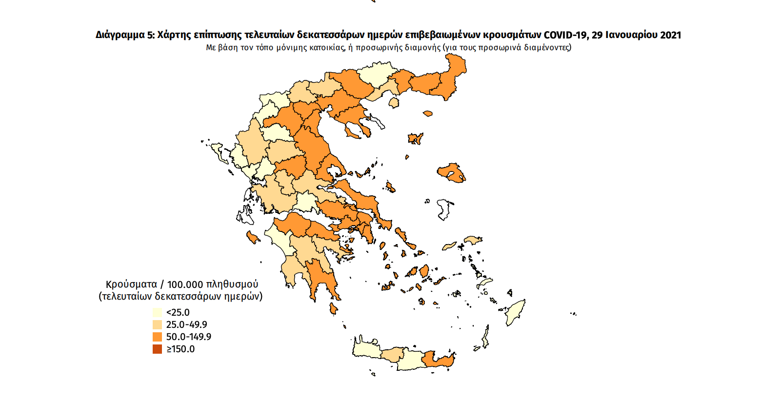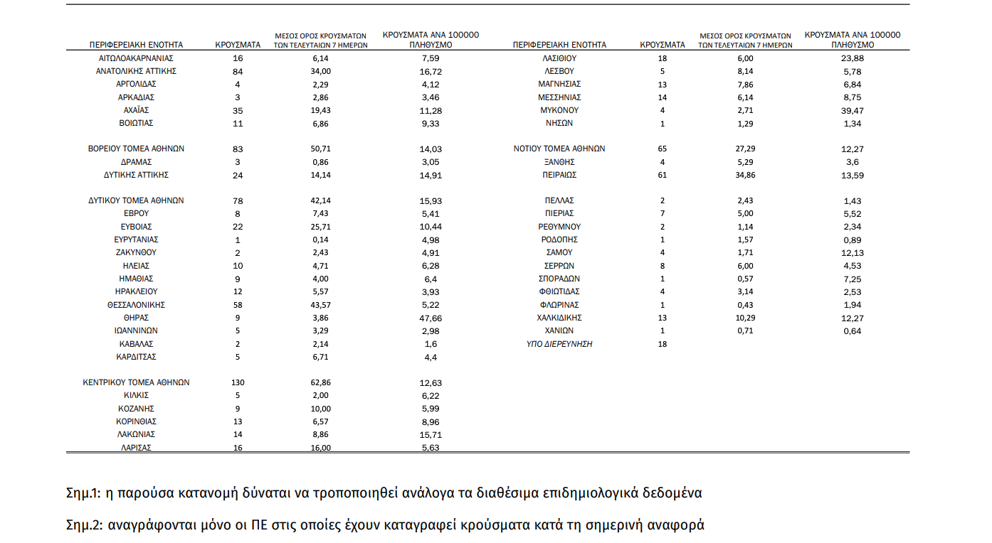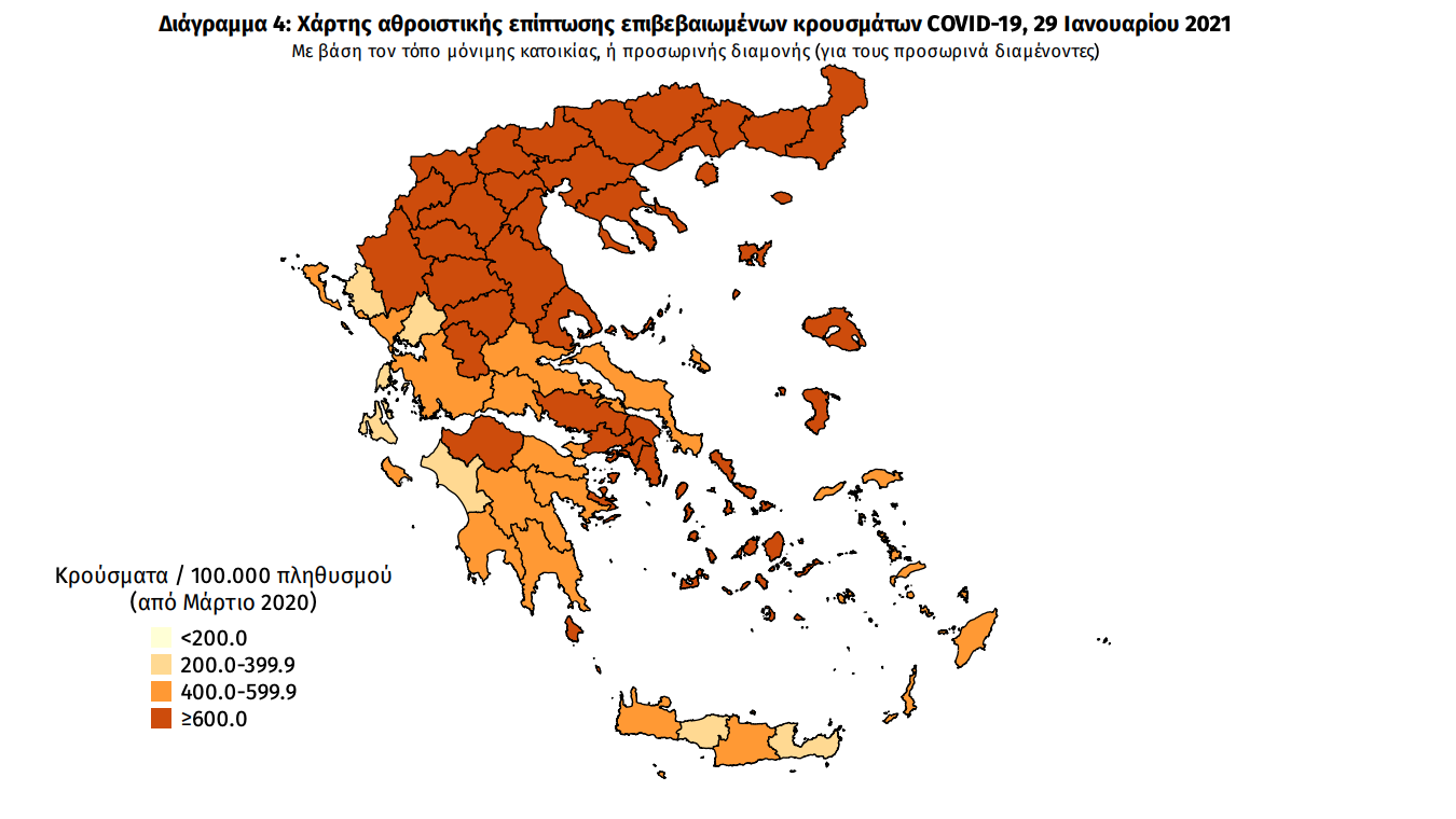 Γεωγραφική διασπορά Ο χάρτης αποτυπώνει τη γεωγραφική κατανομή των συνολικών κρουσμάτων COVID-19 (από την αρχή της επιδημίας) ανά Περιφερειακή Ενότητα της χώρας, με βάση την δηλωθείσα διεύθυνση μόνιμης κατοικίας του ασθενούς, ή τη διεύθυνση προσωρινής διαμονής για τους τουρίστες και άλλους προσωρινά διαμένοντες στην Ελλάδα. Συμπεριλαμβάνονται τόσο κρούσματα με ιστορικό ταξιδίου (“εισαγόμενα”) όσο και κρούσματα με πιθανή εγχώρια μετάδοση.