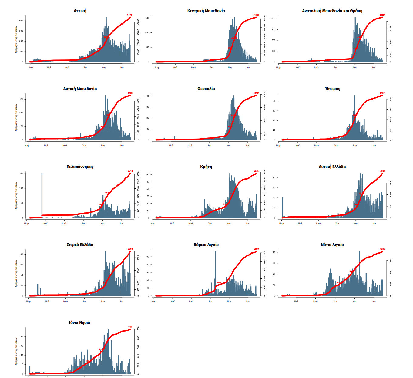 Παράρτημα 1: Επιδημικές καμπύλες κρουσμάτων COVID-19 με βάση την δηλωθείσα διεύθυνση μόνιμης κατοικίας του κρούσματος ή τη διεύθυνση προσωρινής διαμονής για τους τουρίστες και άλλους προσωρινά διαμένοντες στην Ελλάδα. Συμπεριλαμβάνονται τόσο κρούσματα με ιστορικό ταξιδίου όσο και κρούσματα με πιθανή εγχώρια μετάδοση.