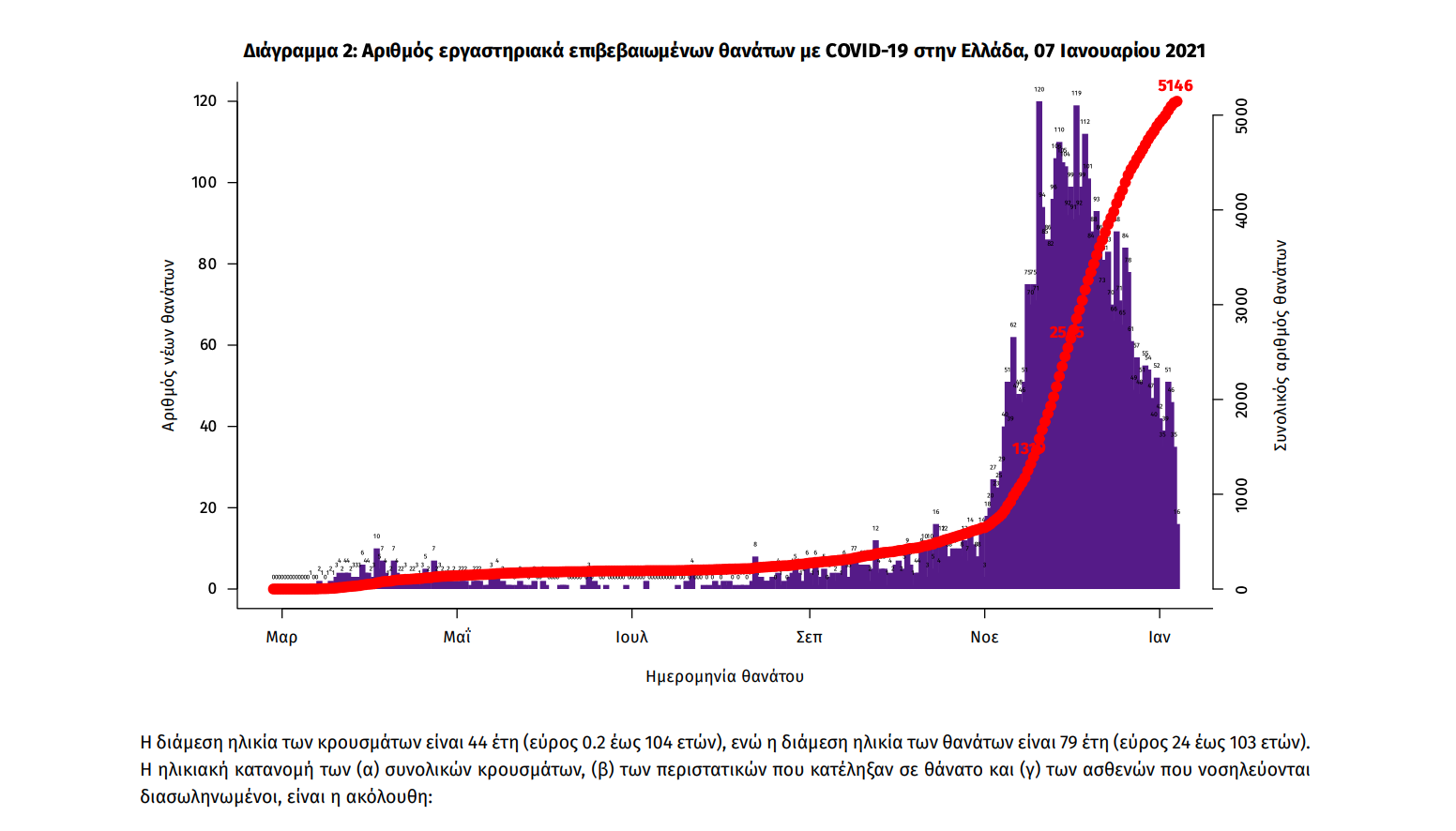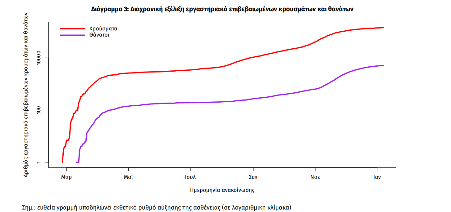 Η διαχρονική εξέλιξη των συνολικών κρουσμάτων και συνολικού αριθμού των θανάτων ασθενών COVID-19 παρουσιάζεται στο ακόλουθο διάγραμμα.