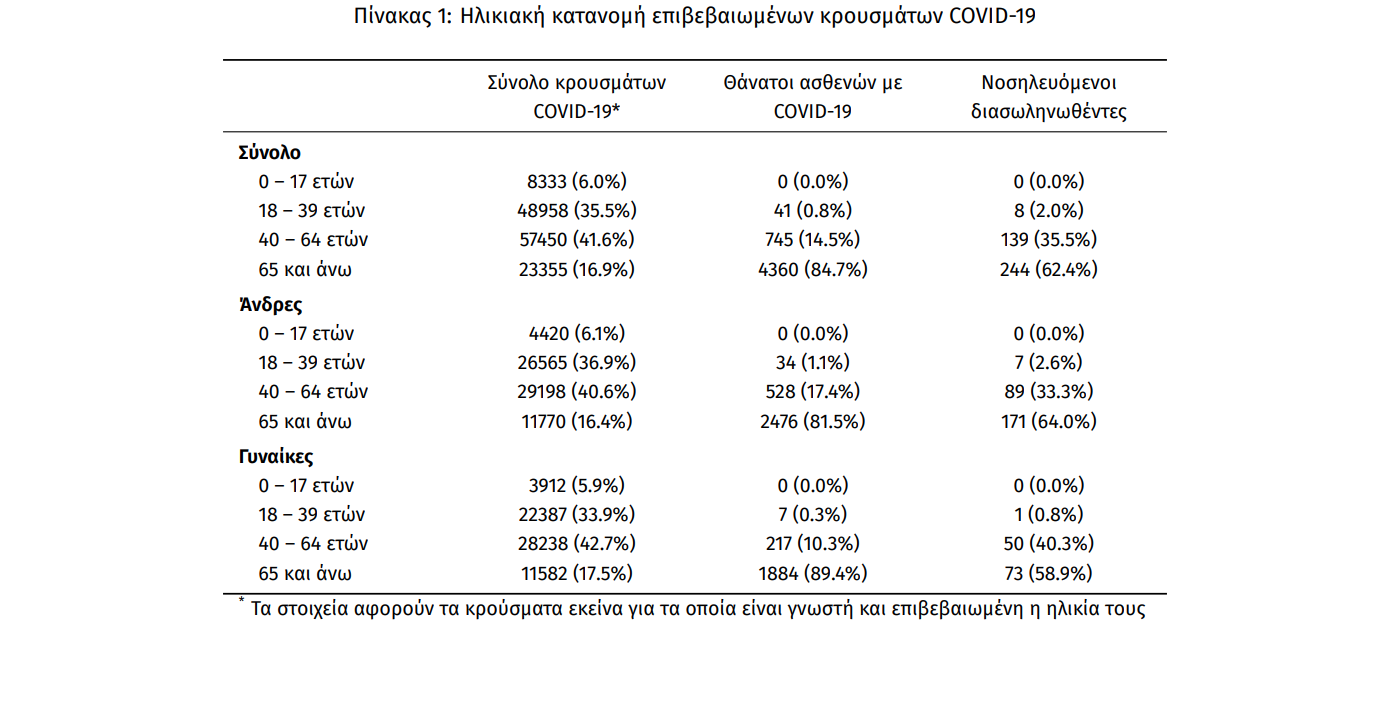 Η διάμεση ηλικία των κρουσμάτων είναι 44 έτη (εύρος 0.2 έως 104 ετών), ενώ η διάμεση ηλικία των θανάτων είναι 79 έτη (εύρος 24 έως 103 ετών). Η ηλικιακή κατανομή των (α) συνολικών κρουσμάτων, (β) των περιστατικών που κατέληξαν σε θάνατο και (γ) των ασθενών που νοσηλεύονται διασωληνωμένοι, είναι η ακόλουθη