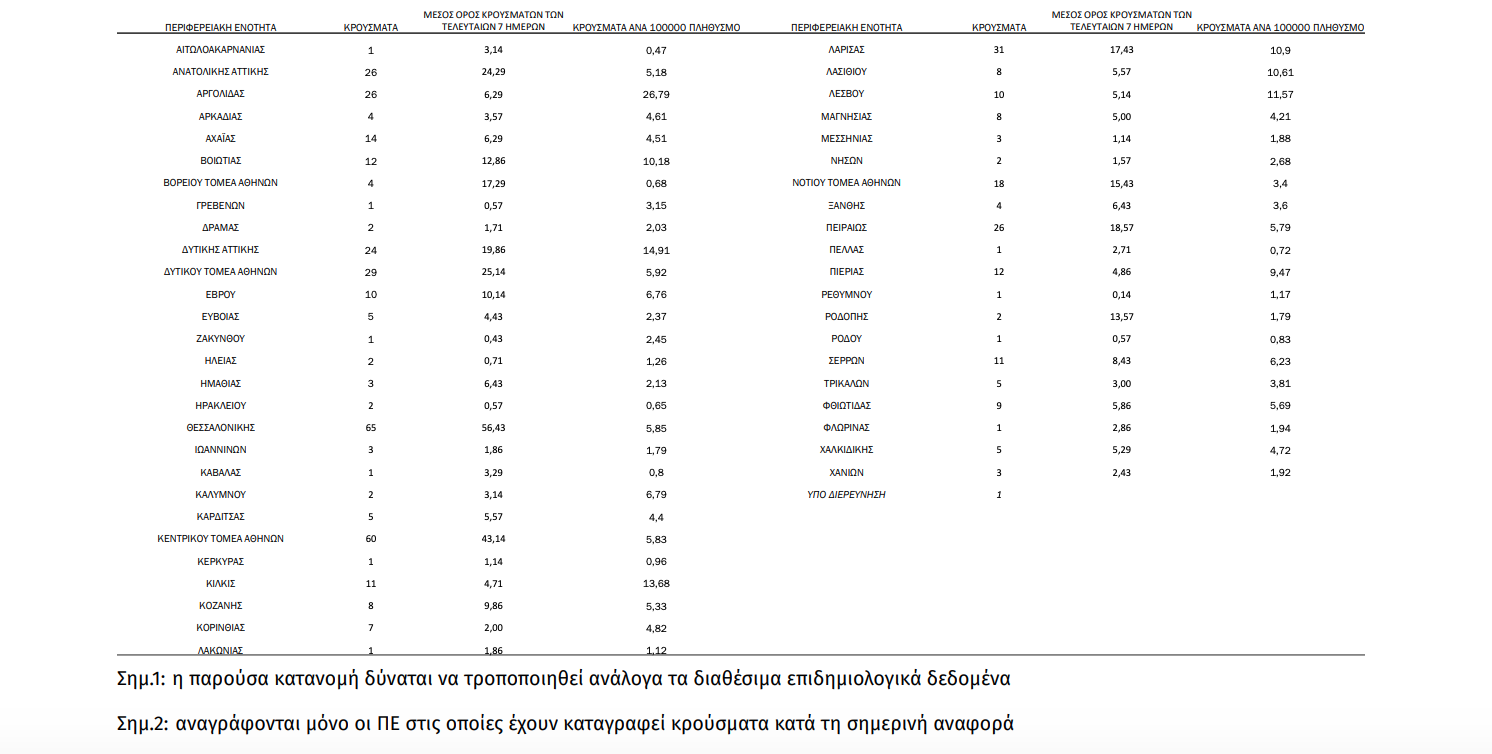 Από το σύνολο των 510 νέων κρουσμάτων του νέου ιού στη χώρα 18 είναι εισαγόμενα και 16 εντοπίστηκαν κατόπιν ελέγχων στις πύλες εισόδου της χώρας. Η κατανομή των 492 νέων εγχώριων κρουσμάτων ανά Περιφερειακή Ενότητα παρουσιάζεται στον κατωτέρω πίνακα. Πίνακας 2: Ημερήσιος αριθμός και κρούσματα ανά 100.000 πληθυσμού επιβεβαιωμένων εγχώριων κρουσμάτων COVID-19 ανά περιφερειακή ενότητα στις 07 Ιανουαρίου 2021