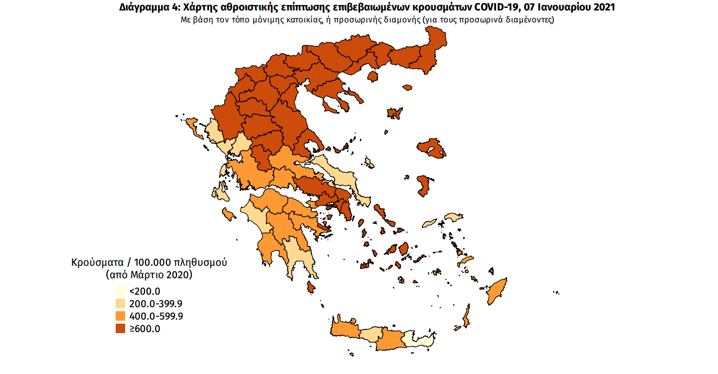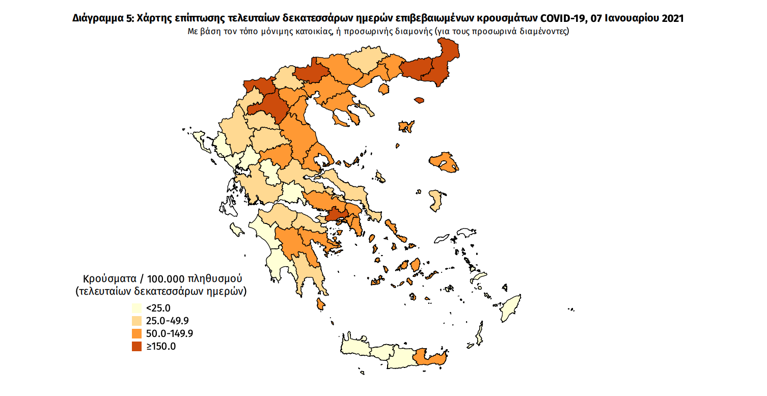 Γεωγραφική διασπορά Ο χάρτης αποτυπώνει τη γεωγραφική κατανομή των συνολικών κρουσμάτων COVID-19 (από την αρχή της επιδημίας) ανά Περιφερειακή Ενότητα της χώρας, με βάση την δηλωθείσα διεύθυνση μόνιμης κατοικίας του ασθενούς, ή τη διεύθυνση προσωρινής διαμονής για τους τουρίστες και άλλους προσωρινά διαμένοντες στην Ελλάδα. Συμπεριλαμβάνονται τόσο κρούσματα με ιστορικό ταξιδίου (“εισαγόμενα”) όσο και κρούσματα με πιθανή εγχώρια μετάδοση.