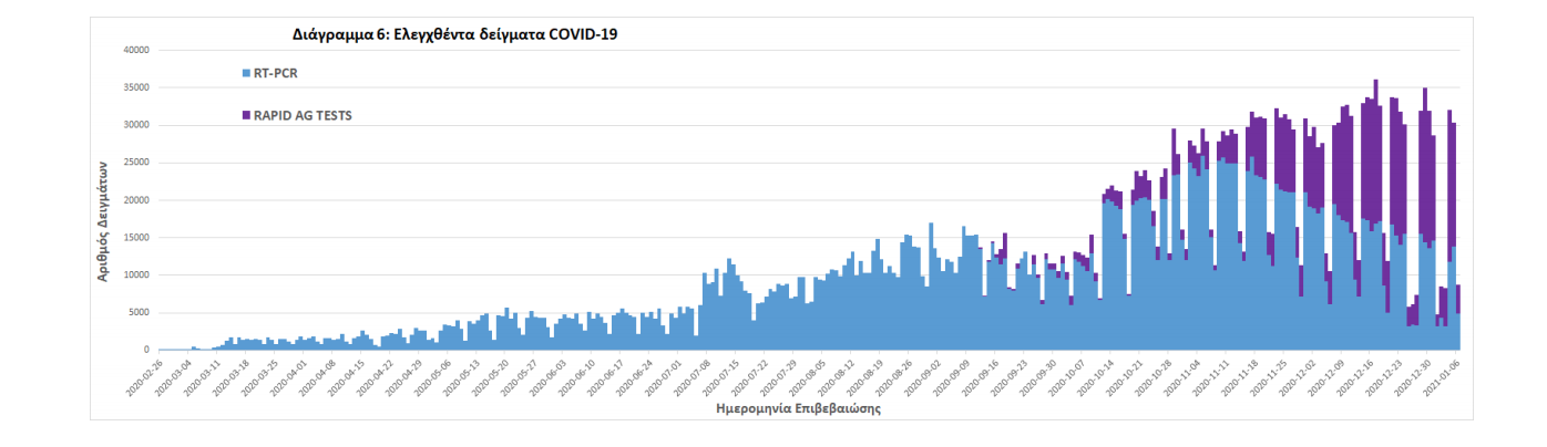 Δείγματα που έχουν ελεγχθεί: Από την 1η Ιανουαρίου 2020 μέχρι σήμερα, στα εργαστήρια που διενεργούν ελέγχους για τον νέο κορωνοϊό (SARS-CoV-2) και που δηλώνουν συστηματικά στον ΕΟΔΥ το σύνολο των δειγμάτων που ελέγχουν, έχουν συνολικά ελεγχθεί 2.859.041 κλινικά δείγματα ενώ από Μονάδες Υγείας και Κλιμάκια του ΕΟΔΥ που διενεργούν ελέγχους Rapid Ag έχουν ελεγχθεί 644.649 δείγματα