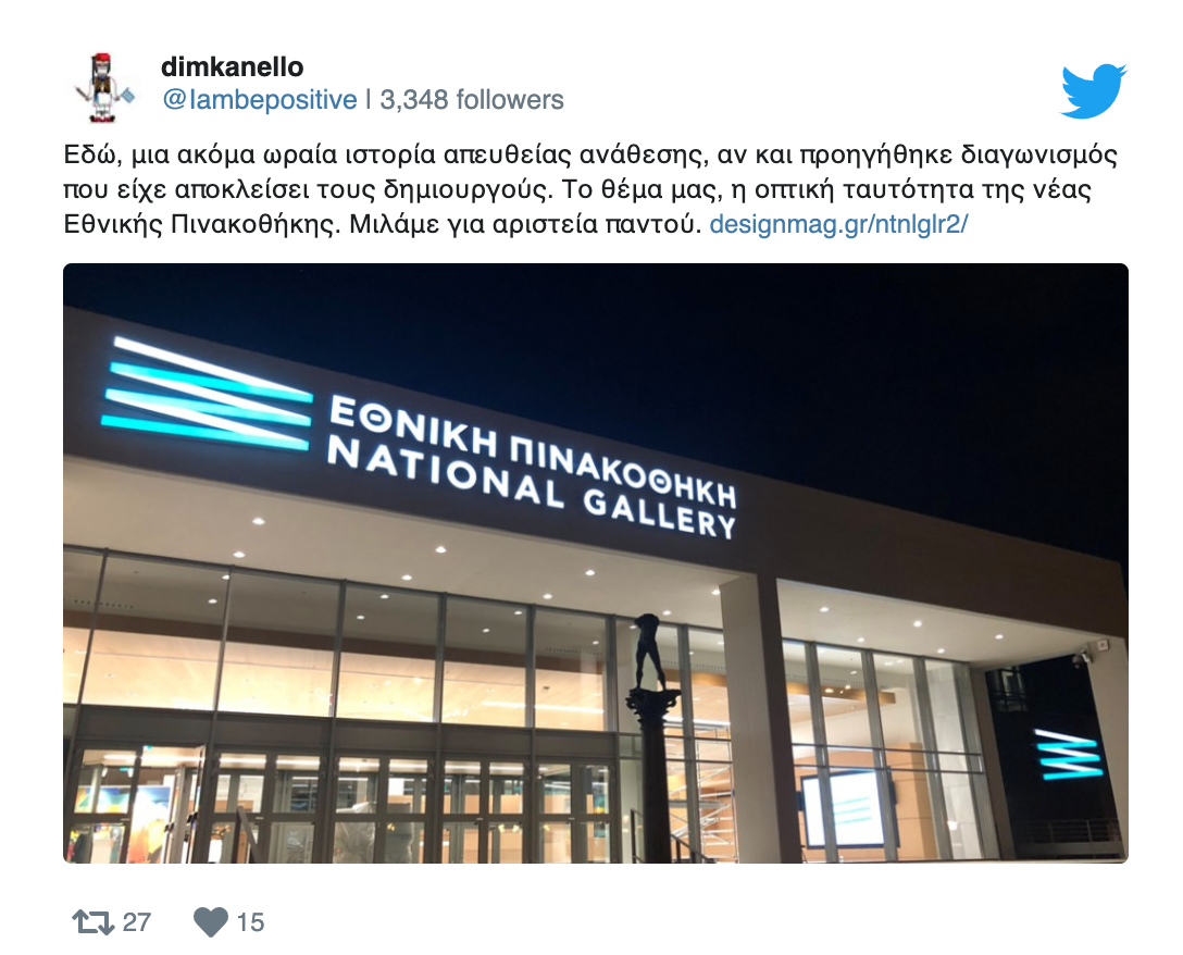 Σε μια εξαιρετικά σοβαρή αποκάλυψη προέβη το designmag.gr του Δημήτρη Φακίνου και αφορά στην απευθείας ανάθεση, σε παράκαμψη όλων των διαδικασιών του διαγωνισμού, δια αποκλεισμού του νικητή του διαγωνισμού μελέτης σήμανσης του χώρου και σχεδιασμού της εταιρικής της ταυτότητας της Εθνικής Πινακοθήκης.