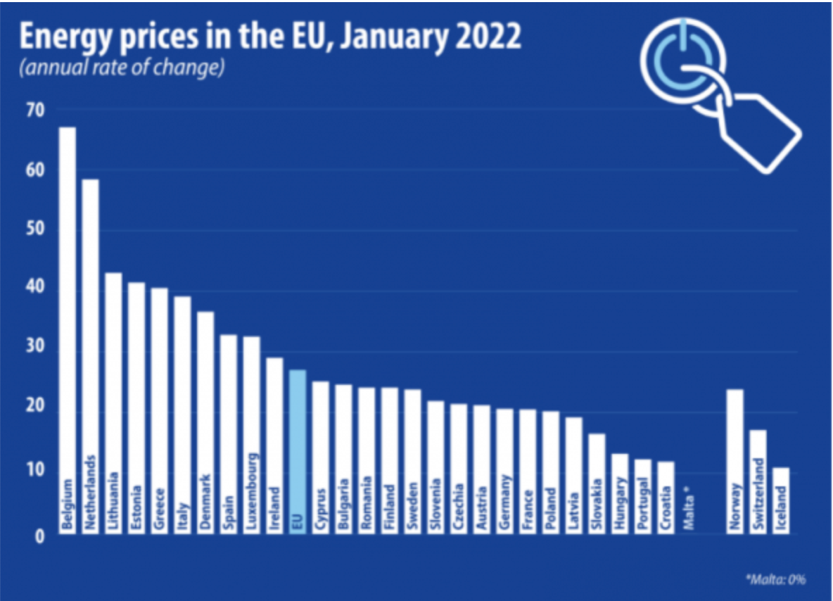 Μεγαλύτερες αυξήσεις από την Ελλάδα τον Ιανουάριο είχαν το Βέλγιο (67%), η Ολλανδία (58%), η Λιθουανία (43%) και η Εσθονία 941%), ενώ στη Μάλτα δεν υπήρξε καμία αύξηση και στην Πορτογαλία και την Κροατία οι αυξήσεις ήταν πολύ χαμηλότερες από τον μέσο όρο (12% και στις δύο), προφανώς λόγω και των υψηλότερων κρατικών επιδοτήσεων.