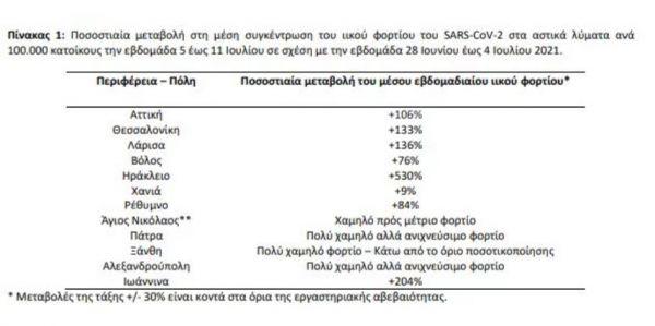 Στο Ηράκλειο Κρήτης, την εβδομάδα 5 έως 11 Ιουλίου 2021 καταγράφηκε αύξηση έως +530% στην ανίχνευση του γονιδιώματος του SARS-CoV-2 στα αστικά λύματα, στη Θεσσαλονίκη αύξηση κατά +133%, αλλά και την Αττική +106%.