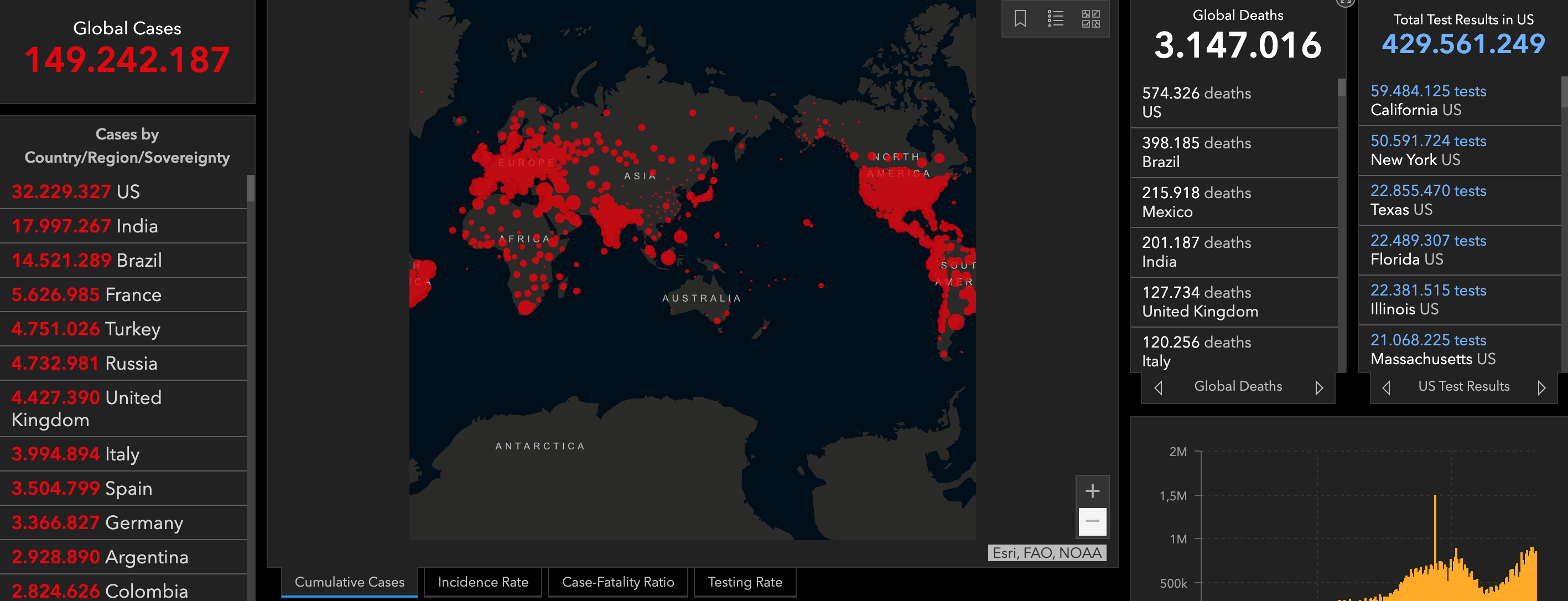 Περισσότεροι από 1.060.900 θάνατοι καταγράφηκαν στην περιοχή από την έναρξη της επιδημίας, εκ των οποίων σχεδόν 3.600 ημερησίως αυτή την περίοδο, αριθμός που παρουσιάζει επίσης ελαφρά μείωση μετά τα μέσα Απριλίου.