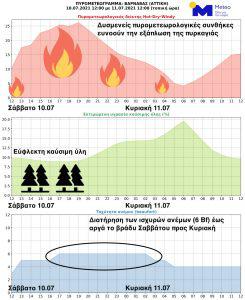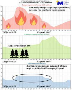 Σύμφωνα με ανακοίνωση της Μετεωρολογικής με βάση τα διαθέσιμα προγνωστικά στοιχεία του Εθνικού Αστεροσκοπείου Αθηνών (ΕΑΑ) – meteo.gr, οι δασικές πυρκαγιές εξελίσσονται υπό δυσμενείς πυρομετεωρολογικές συνθήκες (Εικόνες 1 και 2), γεγονός που ευνοεί την εξάπλωσή τους και δυσχεραίνει σημαντικά το έργο των πυροσβεστικών δυνάμεων.