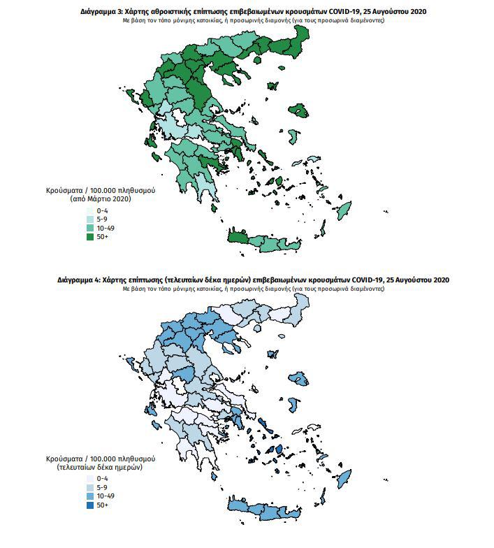 Σήμερα, 26/8/2020, δηλώθηκαν 293 επιπλέον κρούσματα. Από τα 261 εγχώρια κρούσματα, τα 24 συνδέονται με πρόσφατο ταξίδι στο εσωτερικό της χώρας, ενώ τα 16 συνδέονται με επαφή ή στενή επαφή με επιβεβαιωμένο κρούσμα.