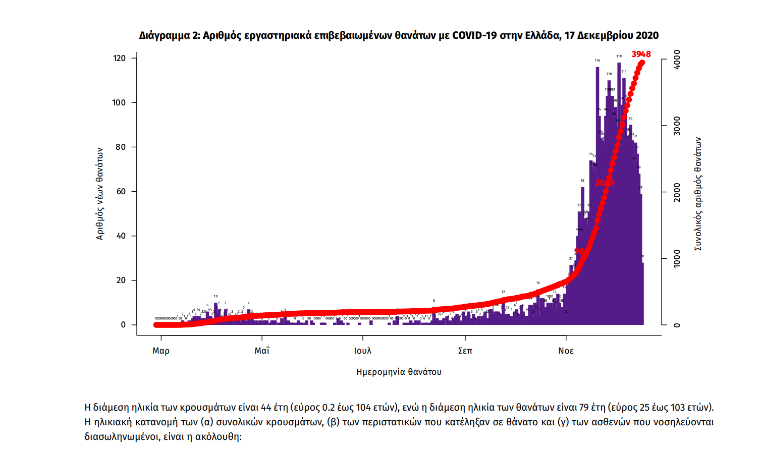 Τέλος, έχουμε 78 ακόμα καταγεγραμμένους θανάτους και 3948 θανάτους συνολικά στη χώρα. 1585 (40.1%) γυναίκες και οι υπόλοιποι άνδρες. Η διάμεση ηλικία των θανόντων συμπολιτών μας ήταν τα 79 έτη και το 95.6% είχε κάποιο υποκείμενο νόσημα ή/και ηλικία 70 ετών και άνω.
