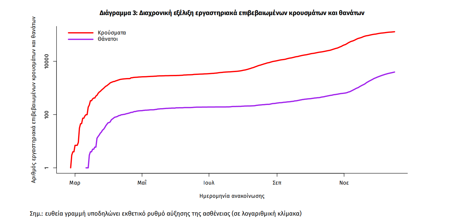 Η διαχρονική εξέλιξη των συνολικών κρουσμάτων και συνολικού αριθμού των θανάτων ασθενών COVID-19 παρουσιάζεται στο ακόλουθο διάγραμμα.