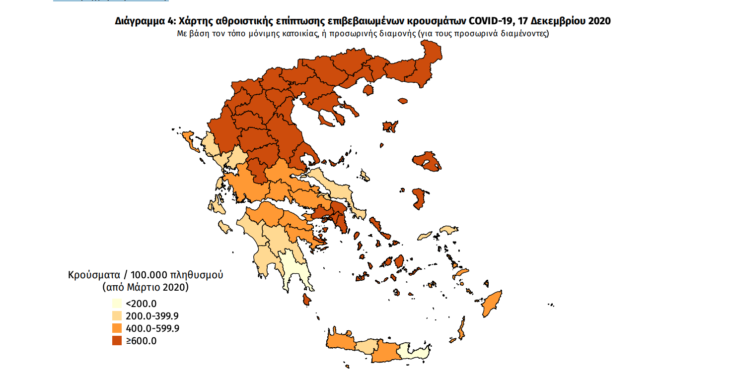 Γεωγραφική διασπορά Ο χάρτης αποτυπώνει τη γεωγραφική κατανομή των συνολικών κρουσμάτων COVID-19 (από την αρχή της επιδημίας) ανά Περιφερειακή Ενότητα της χώρας, με βάση την δηλωθείσα διεύθυνση μόνιμης κατοικίας του ασθενούς, ή τη διεύθυνση προσωρινής διαμονής για τους τουρίστες και άλλους προσωρινά διαμένοντες στην Ελλάδα. Συμπεριλαμβάνονται τόσο κρούσματα με ιστορικό ταξιδίου (“εισαγόμενα”) όσο και κρούσματα με πιθανή εγχώρια μετάδοση.
