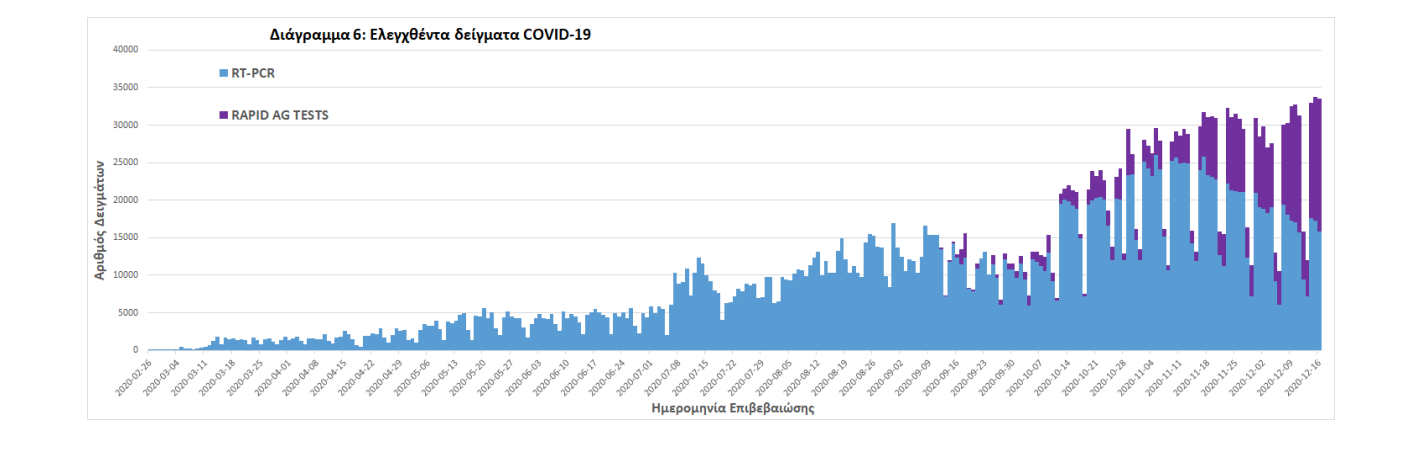 Δείγματα που έχουν ελεγχθεί: Από την 1η Ιανουαρίου 2020 μέχρι σήμερα, στα εργαστήρια που διενεργούν ελέγχους για τον νέο κορωνοϊό (SARS-CoV-2) και που δηλώνουν συστηματικά στον ΕΟΔΥ το σύνολο των δειγμάτων που ελέγχουν, έχουν συνολικά ελεγχθεί 2.640.158 κλινικά δείγματα ενώ από Μονάδες Υγείας και Κλιμάκια του ΕΟΔΥ που διενεργούν ελέγχους Rapid Ag έχουν ελεγχθεί 398.830 δείγματα.