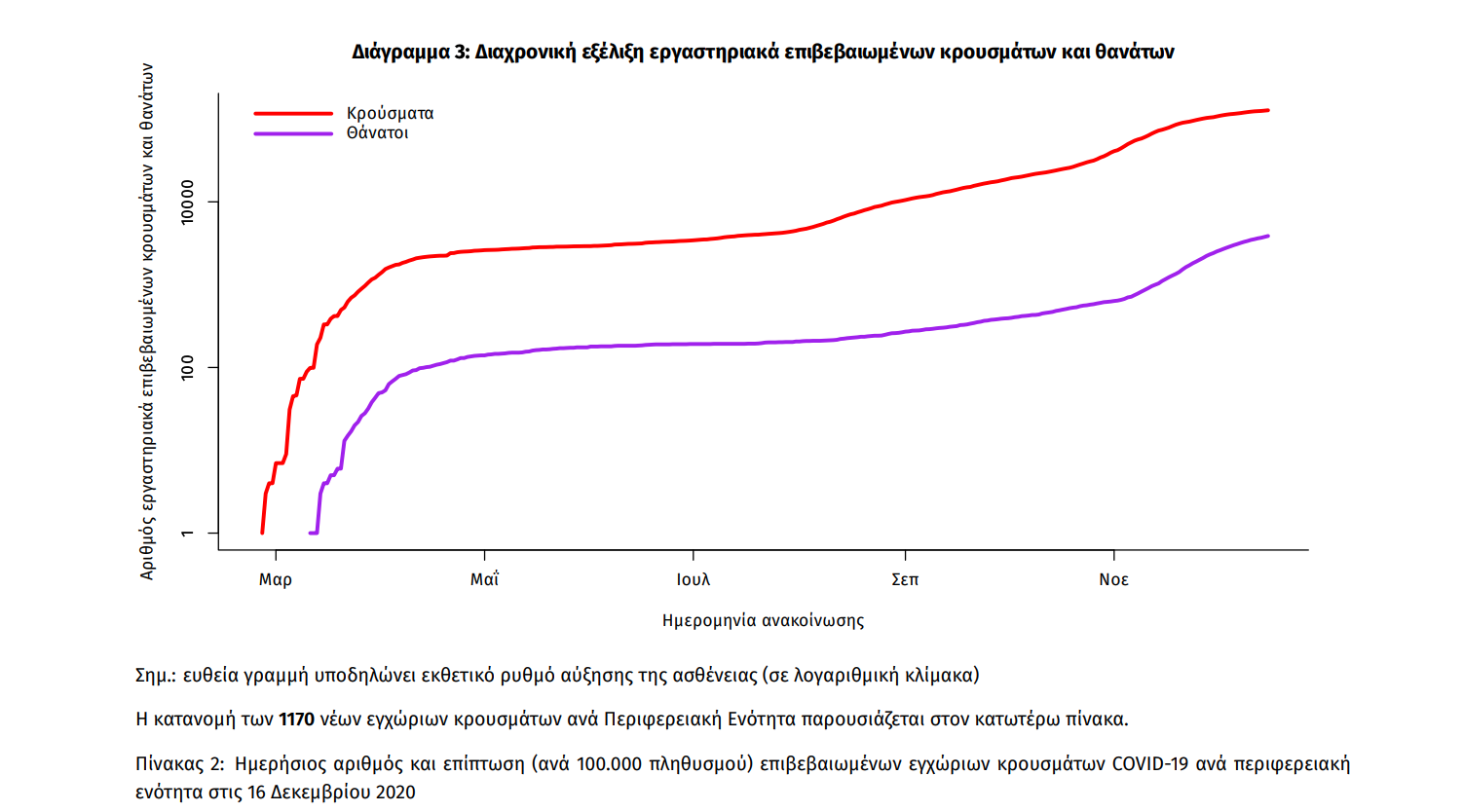 Η διαχρονική εξέλιξη των συνολικών κρουσμάτων και συνολικού αριθμού των θανάτων ασθενών COVID-19 παρουσιάζεται στο ακόλουθο διάγραμμα.