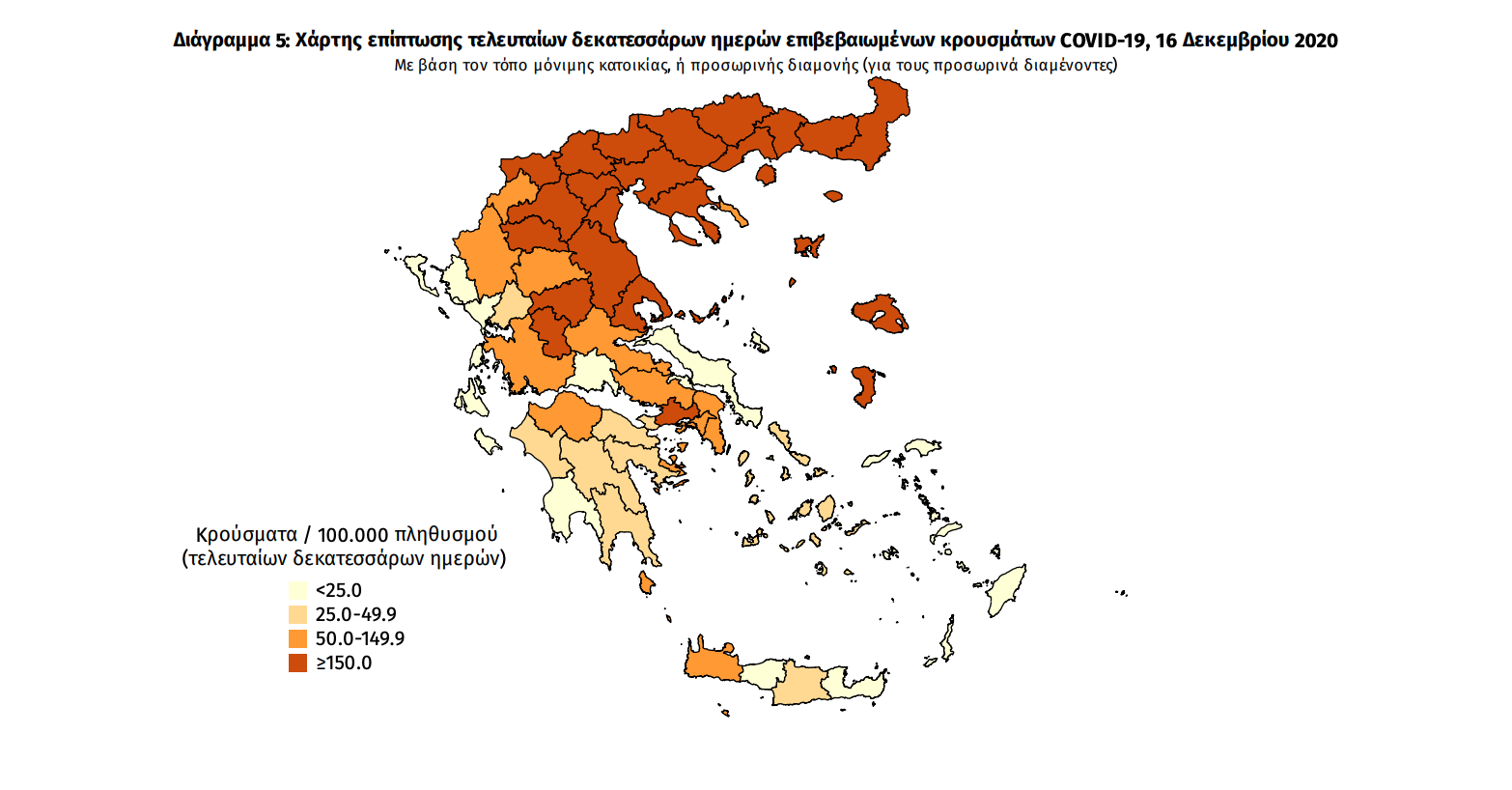 Ο συνολικός αριθμός των κρουσμάτων ανέρχεται σε 127557 (ημερήσια μεταβολή +0.9%), εκ των οποίων 52.5% άνδρες. 1 Οι νέοι θάνατοι ασθενών με COVID-19 είναι 85, ενώ από την έναρξη της επιδημίας έχουν καταγραφεί συνολικά 3870 θάνατοι.Η διάμεση ηλικία των ασθενών που απεβίωσαν είναι 79 έτη. Ο αριθμός των ασθενών που νοσηλεύονται διασωληνωμένοι είναι 552 (70.7% άνδρες). To για την επικράτεια στις 16 Δεκεμβρίου 2020 εκτιμάται σε 0.86 Η ημερήσια κατανομή των επιβεβαιωμένων κρουσμάτων είναι η ακόλουθη (η γραμμή παριστάνει την συνολική, αθροιστική κατανομή των κρουσμάτων).