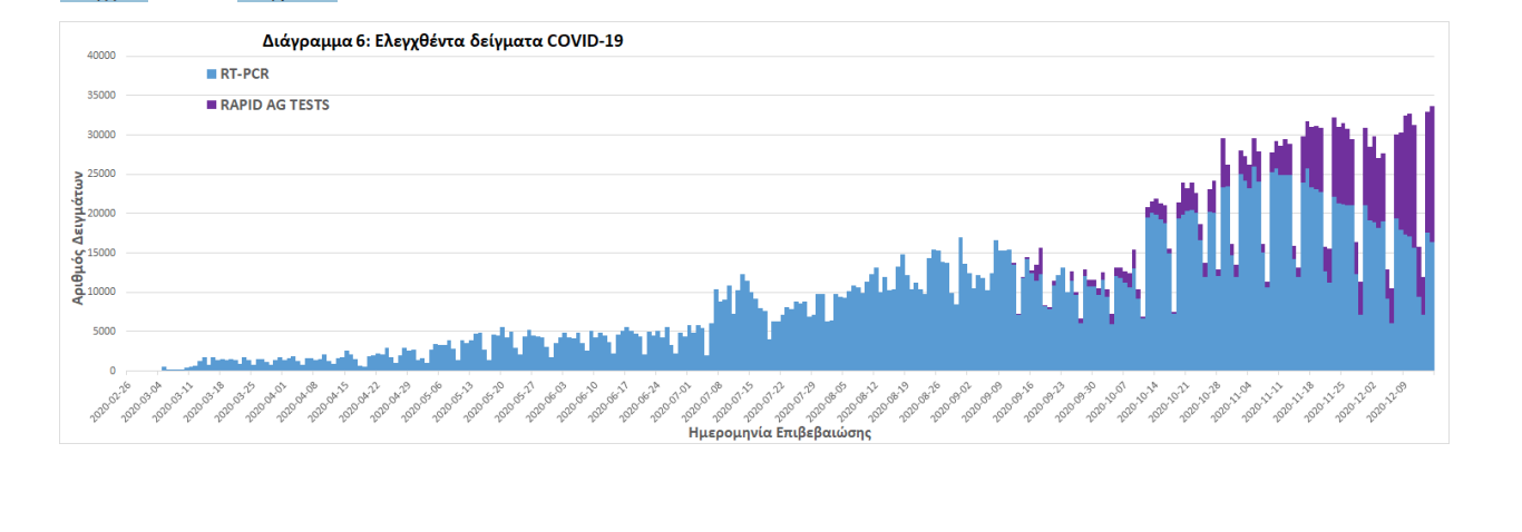 Δείγματα που έχουν ελεγχθεί: Από την 1η Ιανουαρίου 2020 μέχρι σήμερα, στα εργαστήρια που διενεργούν ελέγχους για τον νέο κορωνοϊό (SARS-CoV-2) και που δηλώνουν συστηματικά στον ΕΟΔΥ το σύνολο των δειγμάτων που ελέγχουν, έχουν συνολικά ελεγχθεί 2.624.305 κλινικά δείγματα ενώ από Μονάδες Υγείας και Κλιμάκια του ΕΟΔΥ που διενεργούν ελέγχους Rapid Ag έχουν ελεγχθεί 381.174 δείγματα.
