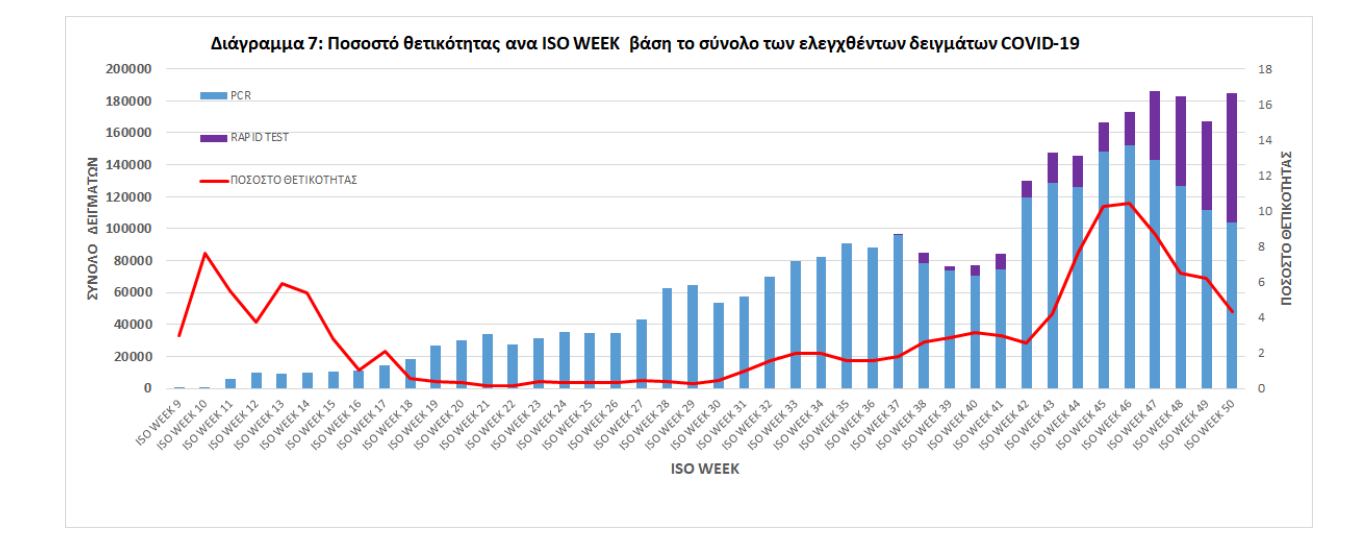 Την εβδομάδα 7 – 13 Δεκεμβρίου (Iso Week 50) το ποσοστό θετικότητας ήταν 4.34% σε σύνολο 104.172 RT-PCR και 80.466 Rapid Ag τεστ που πραγματοποιήθηκαν