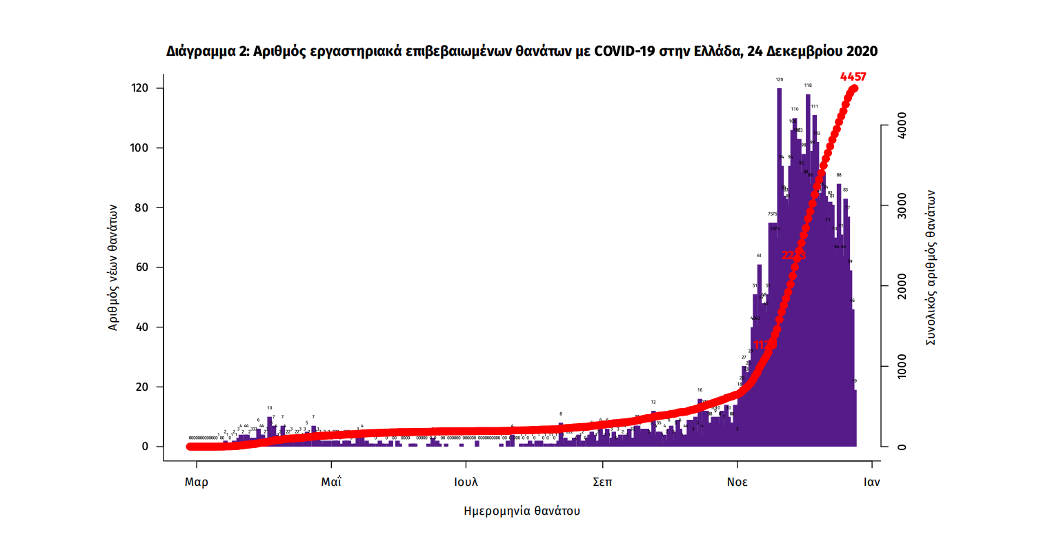 1 Οι νέοι θάνατοι ασθενών με COVID-19 είναι 55, ενώ από την έναρξη της επιδημίας έχουν καταγραφεί συνολικά 4457 θάνατοι.Η διάμεση ηλικία των ασθενών που απεβίωσαν είναι 79 έτη. Ο αριθμός των ασθενών που νοσηλεύονται διασωληνωμένοι είναι 476 (67.4% άνδρες). Η ημερήσια κατανομή των επιβεβαιωμένων κρουσμάτων είναι η ακόλουθη (η γραμμή παριστάνει την συνολική, αθροιστική κατανομή των κρουσμάτων).