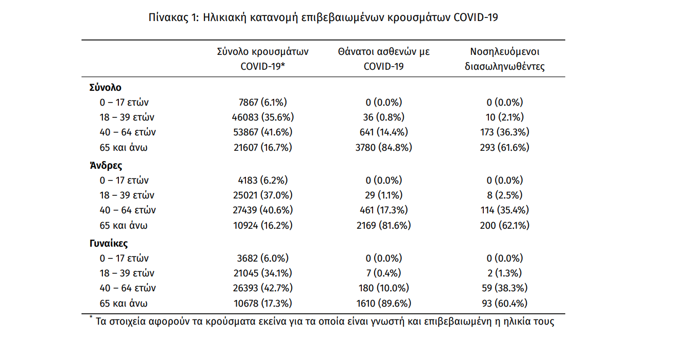 Η διάμεση ηλικία των κρουσμάτων είναι 44 έτη (εύρος 0.2 έως 104 ετών), ενώ η διάμεση ηλικία των θανάτων είναι 79 έτη (εύρος 24 έως 103 ετών). Η ηλικιακή κατανομή των (α) συνολικών κρουσμάτων, (β) των περιστατικών που κατέληξαν σε θάνατο και (γ) των ασθενών που νοσηλεύονται διασωληνωμένοι, είναι η ακόλουθη: