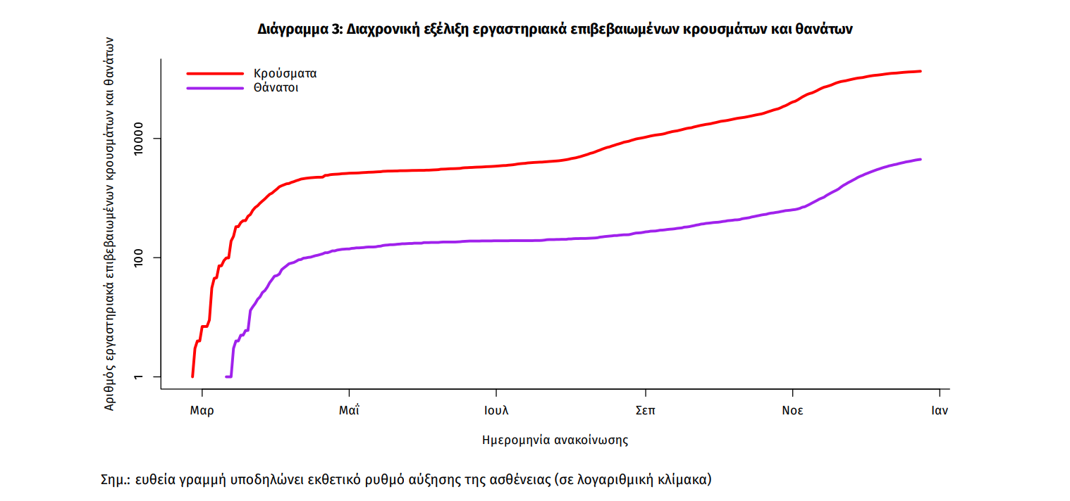 Η διαχρονική εξέλιξη των συνολικών κρουσμάτων και συνολικού αριθμού των θανάτων ασθενών COVID-19 παρουσιάζεται στο ακόλουθο διάγραμμα