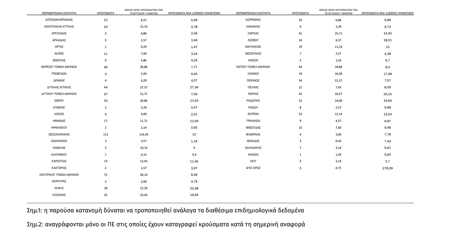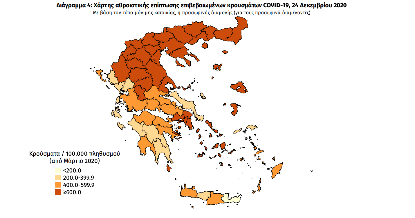 Γεωγραφική διασπορά Ο χάρτης αποτυπώνει τη γεωγραφική κατανομή των συνολικών κρουσμάτων COVID-19 (από την αρχή της επιδημίας) ανά Περιφερειακή Ενότητα της χώρας, με βάση την δηλωθείσα διεύθυνση μόνιμης κατοικίας του ασθενούς, ή τη διεύθυνση προσωρινής διαμονής για τους τουρίστες και άλλους προσωρινά διαμένοντες στην Ελλάδα. Συμπεριλαμβάνονται τόσο κρούσματα με ιστορικό ταξιδίου (“εισαγόμενα”) όσο και κρούσματα με πιθανή εγχώρια μετάδοση.