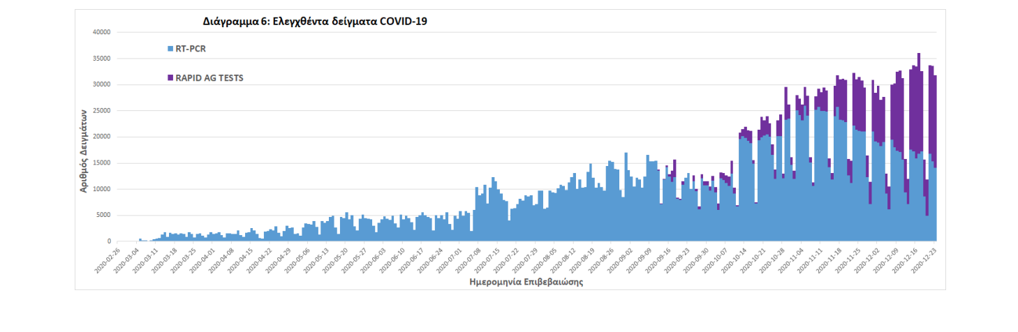 Δείγματα που έχουν ελεγχθεί: Από την 1η Ιανουαρίου 2020 μέχρι σήμερα, στα εργαστήρια που διενεργούν ελέγχους για τον νέο κορωνοϊό (SARS-CoV-2) και που δηλώνουν συστηματικά στον ΕΟΔΥ το σύνολο των δειγμάτων που ελέγχουν, έχουν συνολικά ελεγχθεί 2.733.988 κλινικά δείγματα ενώ από Μονάδες Υγείας και Κλιμάκια του ΕΟΔΥ που διενεργούν ελέγχους Rapid Ag έχουν ελεγχθεί 500.257 δείγματα.